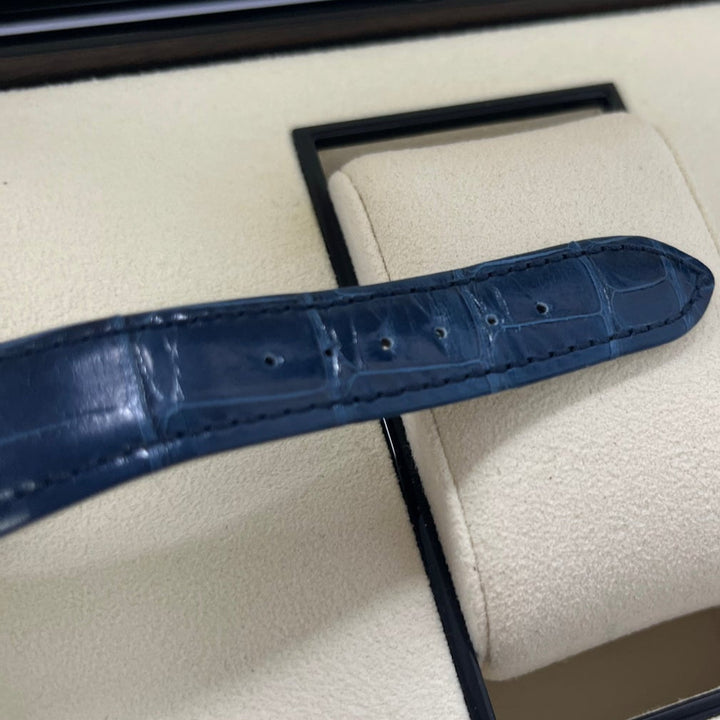 Alligator leather with square scales, hand-stitched, shiny dark blue. Prong buckle.