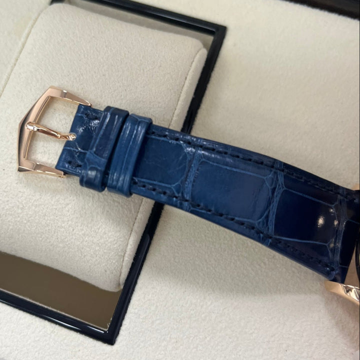 Representing a combination of two popular Patek Philippe complications, the self-winding flyback chronograph with Annual Calendar, Reference 5905, comes in a new rose gold version with a sunburst blue dial – a modern and elegant color accentuating the timeless style of this flagship model.