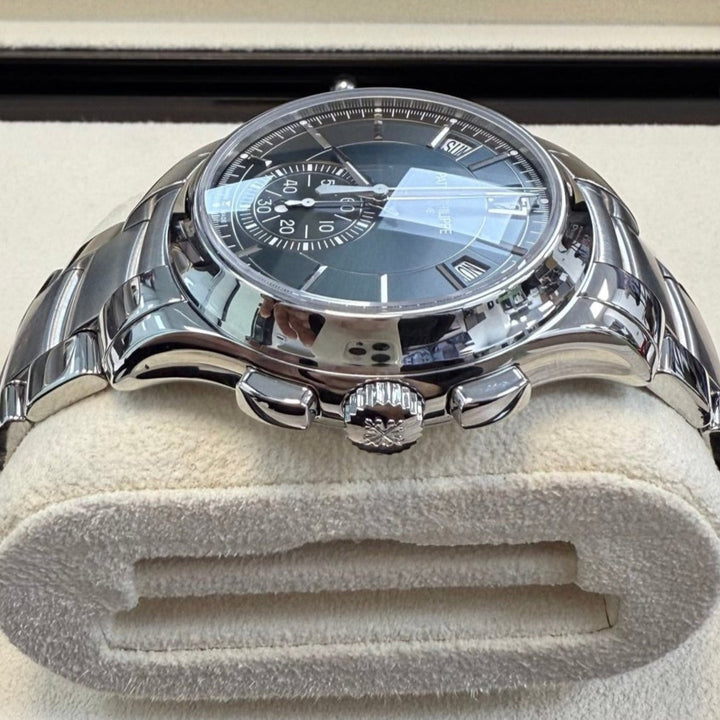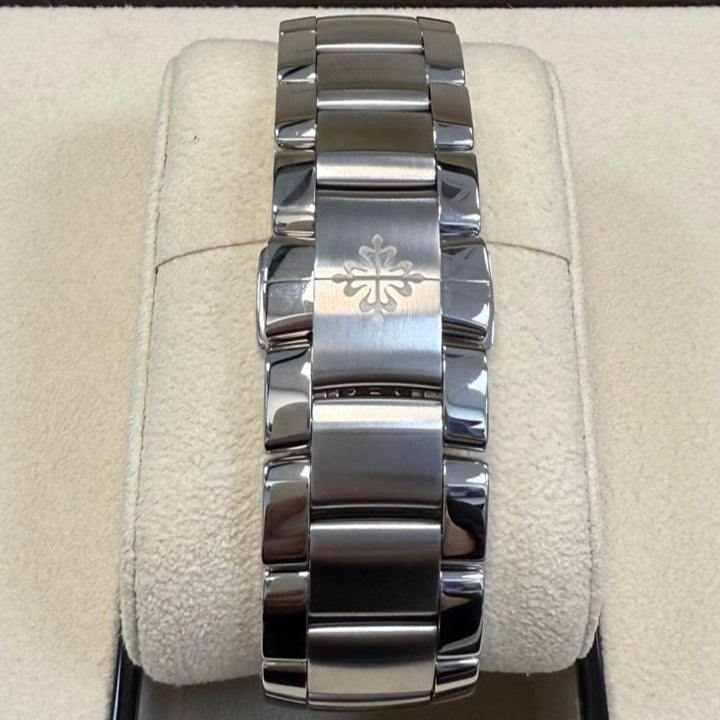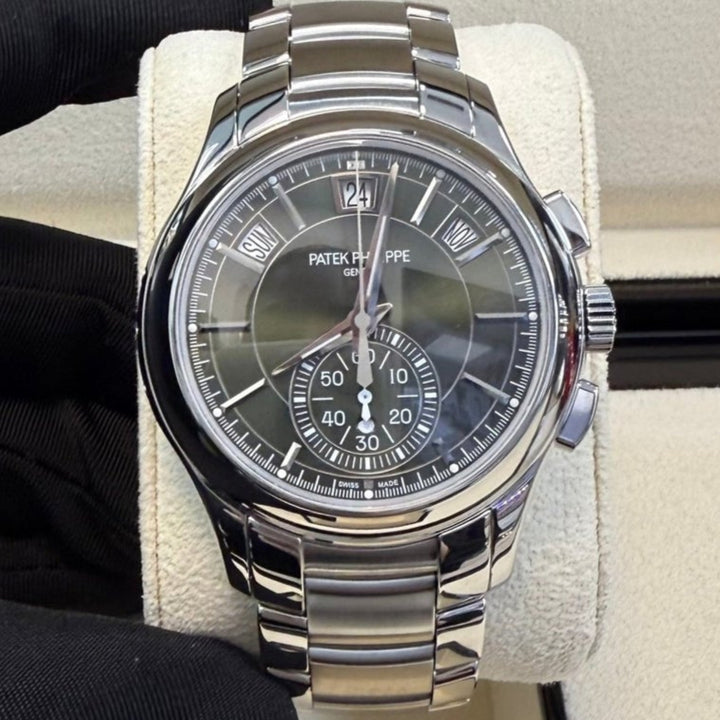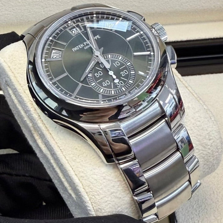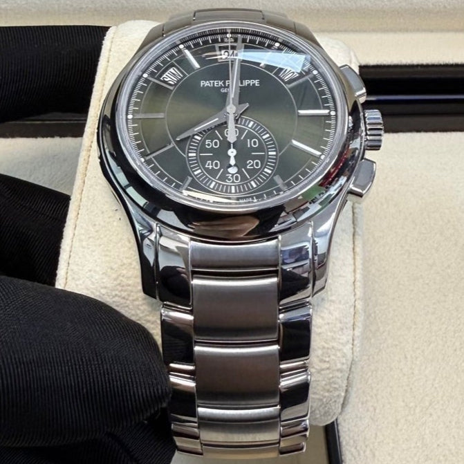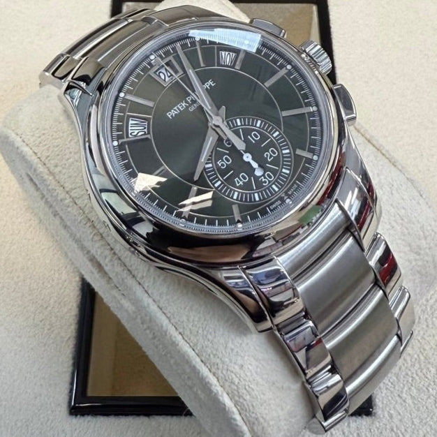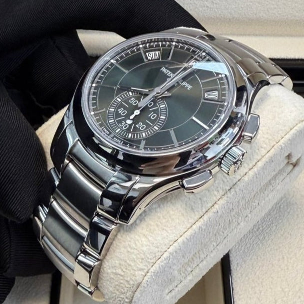 Stainless steel case with a stainless steel bracelet. Fixed stainless steel bezel. Green dial with luminous silver-tone hands and index hour markers. Minute markers around the outer rim. Dial Type: Analog. Luminescent hands and markers. Annual calendar - date display at the 12 o'clock position. Month display at the 2 o'clock position. Day of the week display at the 10 o'clock position. Small seconds sub-dial. Patek Philippe calibre CH 28-250 QA 24H automatic movement, based upon Patek Philippe CH 28-520 IRM QA 24H, containing 37 Jewels, composed of 402 parts, bitting at 28800 vph, and has a power reserve of approximately 55 hours. Scratch resistant sapphire crystal. Screw down crown. Transparent case back. Round case shape. Case size: 42 mm. Deployment clasp with a push button release. Water resistant at 30 meters / 100 feet. Functions: annual calendar, chronograph, column wheel, flyback, date, day, hour, minute, second, day/night indicator.
