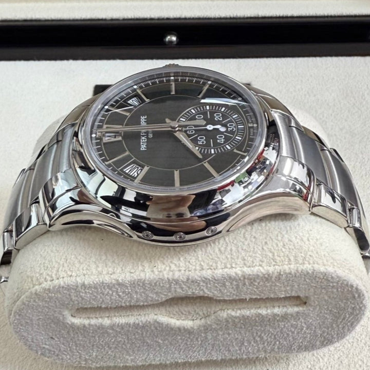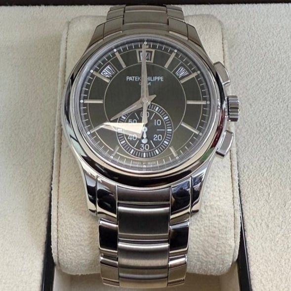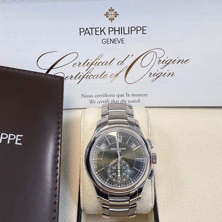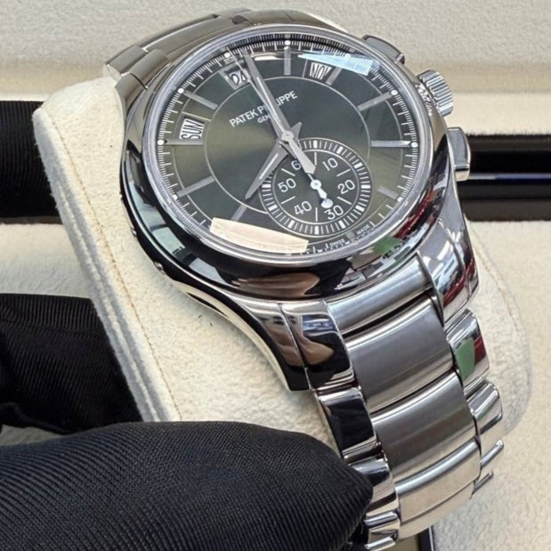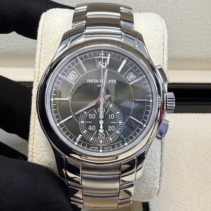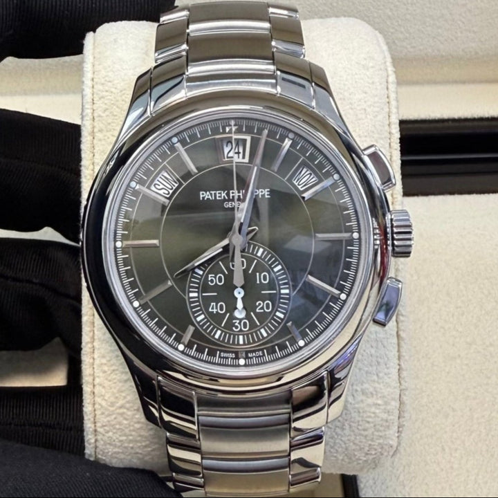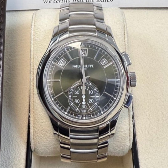 Stainless steel case with a stainless steel bracelet. Fixed stainless steel bezel. Green dial with luminous silver-tone hands and index hour markers. Minute markers around the outer rim. Dial Type: Analog. Luminescent hands and markers. Annual calendar - date display at the 12 o'clock position. Month display at the 2 o'clock position. Day of the week display at the 10 o'clock position. Small seconds sub-dial. Patek Philippe calibre CH 28-250 QA 24H automatic movement, based upon Patek Philippe CH 28-520 IRM QA 24H, containing 37 Jewels, composed of 402 parts, bitting at 28800 vph, and has a power reserve of approximately 55 hours. Scratch resistant sapphire crystal. Screw down crown. Transparent case back. Round case shape. Case size: 42 mm. Deployment clasp with a push button release. Water resistant at 30 meters / 100 feet. Functions: annual calendar, chronograph, column wheel, flyback, date, day, hour, minute, second, day/night indicator.