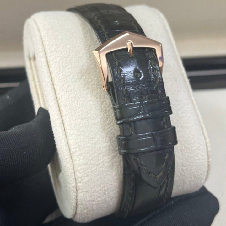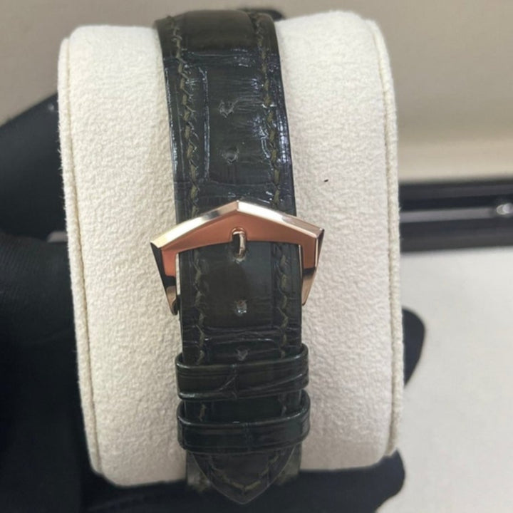 Annual Calendar Reference 5205, with its day/date/month apertures arranged along the arc of a circle, was launched in 2010 as two white gold versions. In 2022, Patek Philippe revisits this model in an original and contemporary color. The case is distinguished by its concave bezel, its hollowed flanks and its skeletonized lugs. This refined architecture is entirely hand-polished by the artisans of the Manufacture. The olive green dial is enlivened by a sunburst motif and by a black gradient around the rim. The day/date/month apertures in the upper part ensure perfect readability of the Annual Calendar indications, with a rose gold frame at 12 o’clock accentuating the most important item of information, the date.