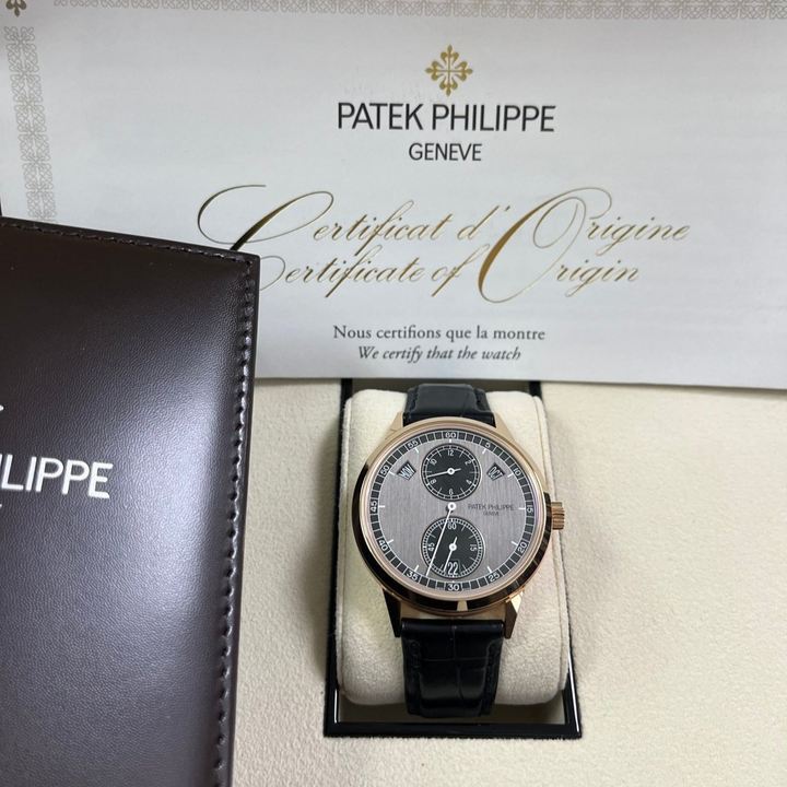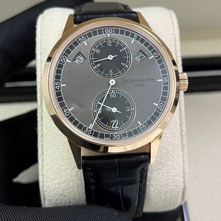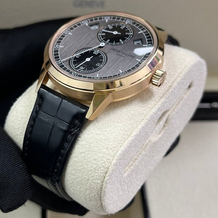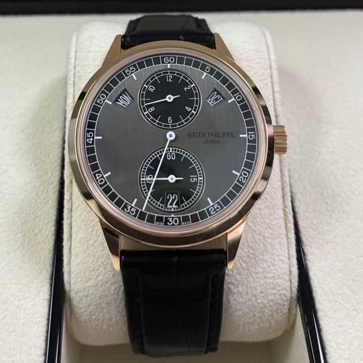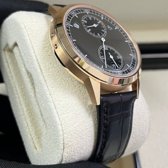Patek Philippe revisits the unique style of its Annual Calendar Regulator by presenting it in rose gold, paired with a two-tone dial in graphite and ebony-black with a vertical satin finish.