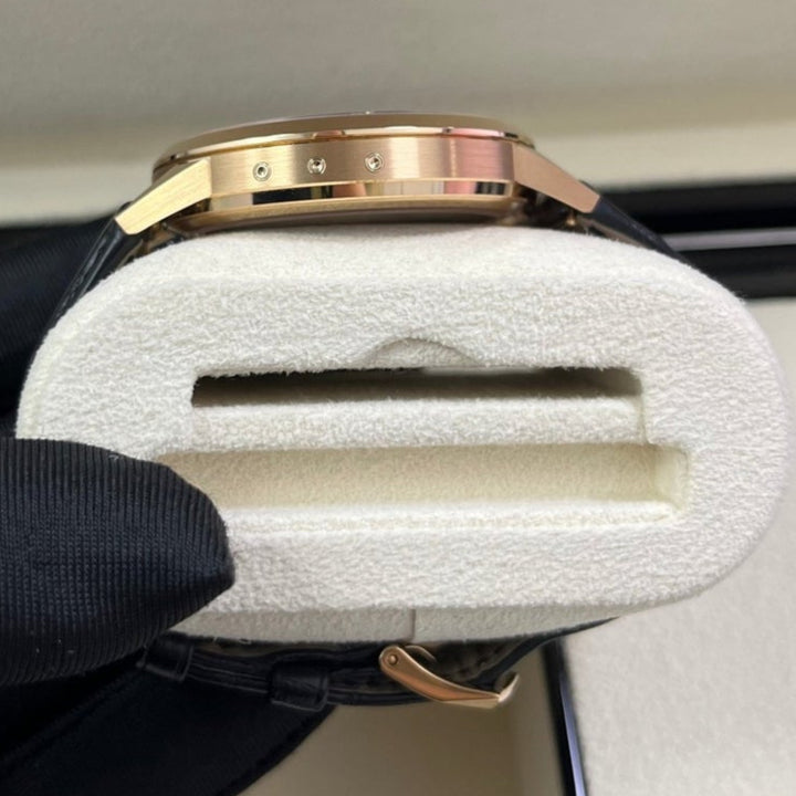 Rose gold. Sapphire crystal case back. Water-resistant to 30 m. Diameter: 40.5 mm. Height: 10 mm.