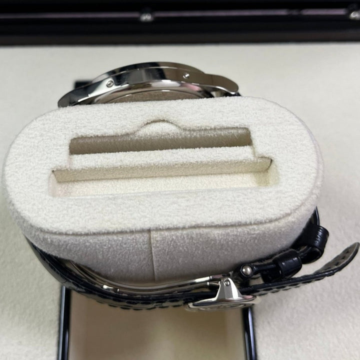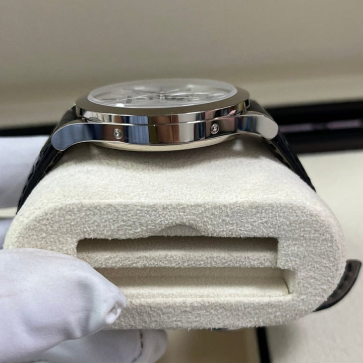 White gold. Sapphire crystal case back. Water-resistant to 30 m. Case diameter: 38.5 mm. Height: 11.2 mm.