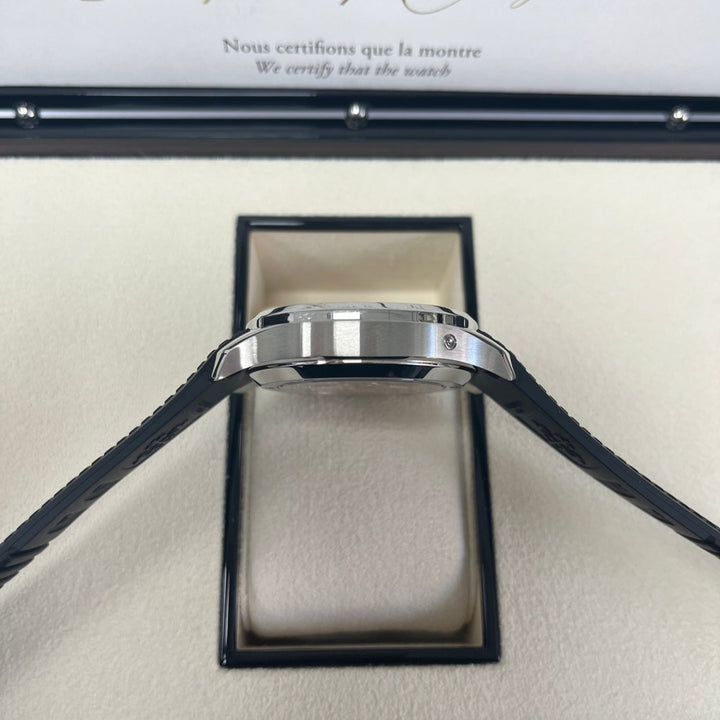 This Aquanaut 5968A features striking orange second and chronograph hands on a black embossed dial. The white gold-applied numerals are luminescent, emitting a teal-green glow in the darkness.