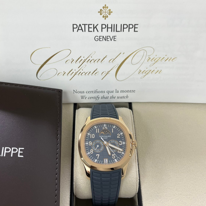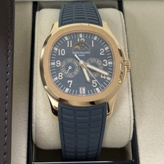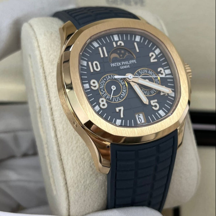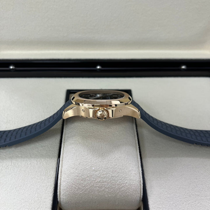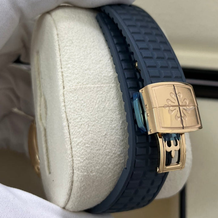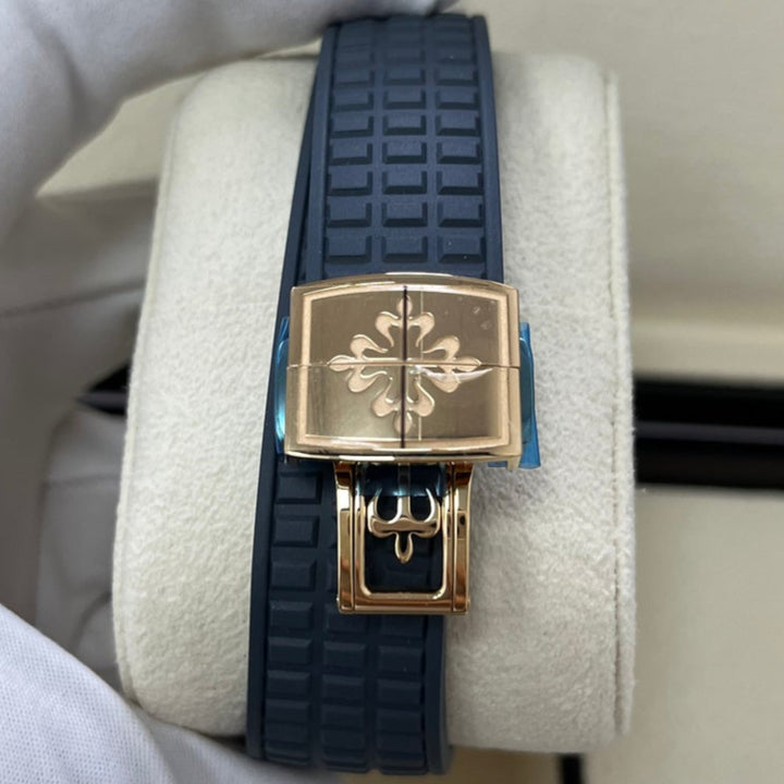 This new Patek Philippe Ladies Aquanaut features the patented Annual Calendar: a complete day/date/month calendar requiring only one manual correction per year, at the end of February. The iconic design of the 39.9mm rose gold case and bezel with a rounded octagonal shape is enhanced by the contrast between polished and satin-brushed finishes. The contemporary “sporty chic" style is reinforced by the blue-gray dial and composite strap with Aquanaut pattern.