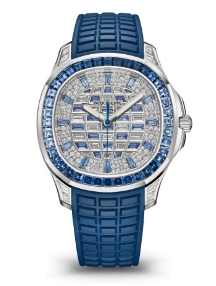 The dial center is paved with baguette-cut diamonds and blue sapphires forming a checkerboard pattern recalling the Aquanaut collection’s emblematic pattern. The chapter ring alternates between baguette-cut blue sapphire hour-markers and snow-set brilliant-cut diamonds.