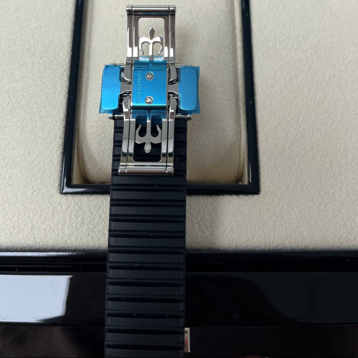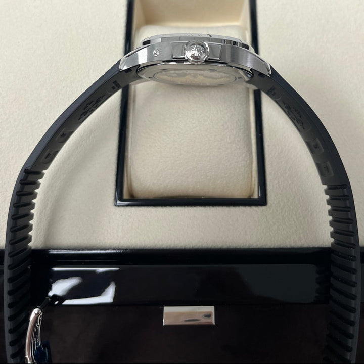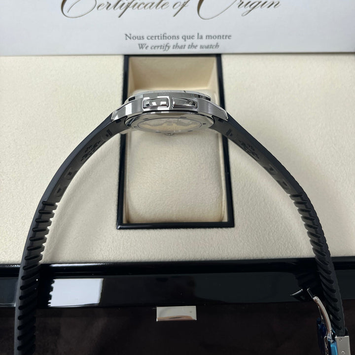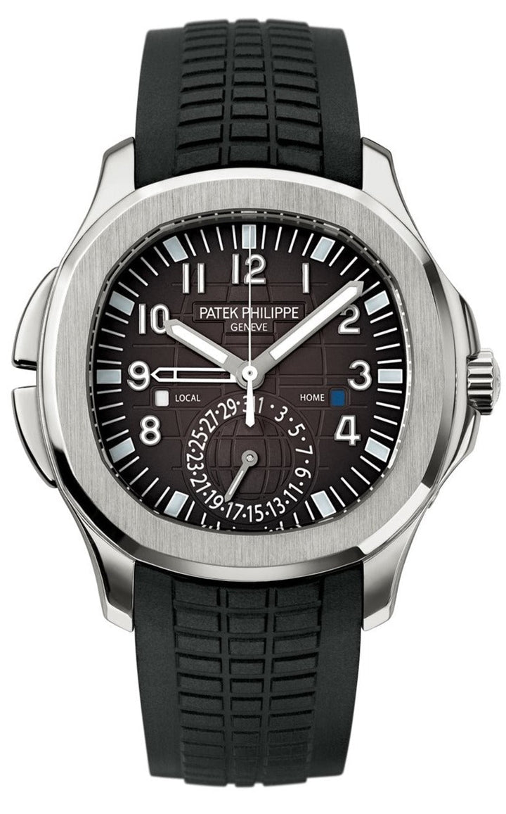 40.8 mm stainless steel case, sapphire-crystal back, black embossed dial with gold applied numerals and luminescent hour markers, caliber 324 S C FUS self-winding movement with Aquanaut Travel Time dual time zone mechanism indicating local and home time, local and home day/night indication in apertures, local date by hand, sweep seconds hand, approximately 35-45 hours of power reserve, black Tropical composite strap, Aquanaut fold-over buckle. Water-resistant up to 120 meters.