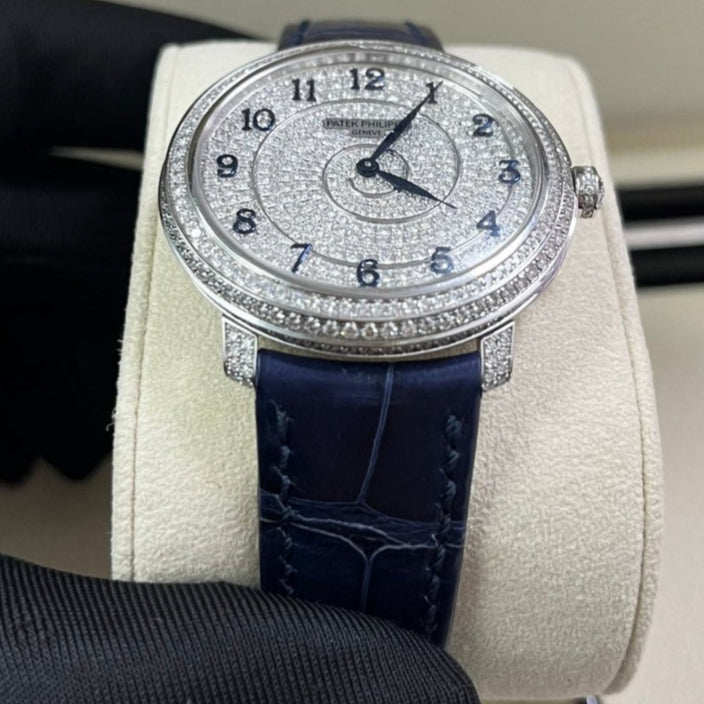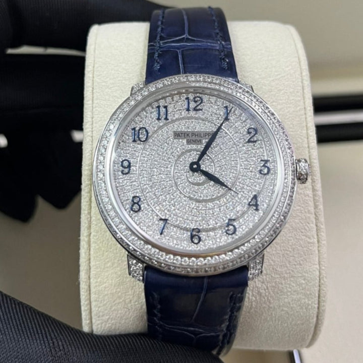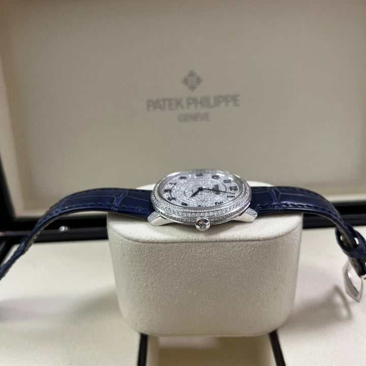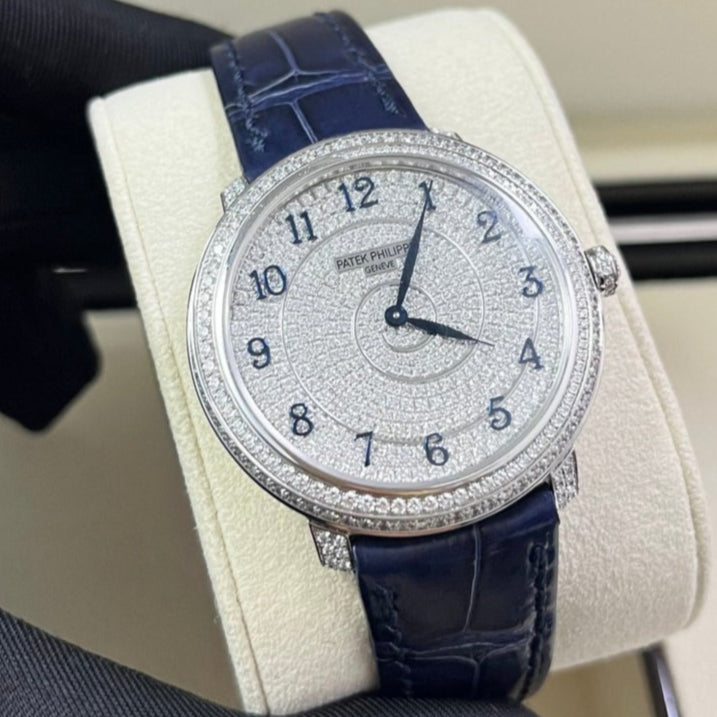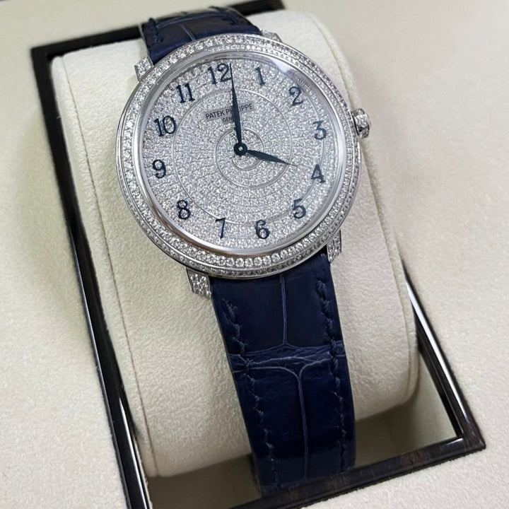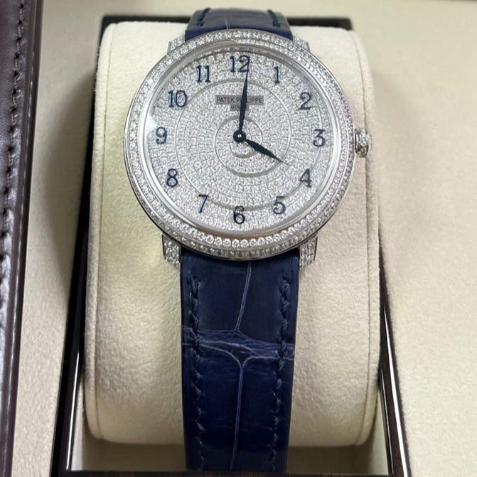 18kt white gold case with a blue alligator band. Fixed bezel with diamond set. Silver-tone dial with Arabic numeral hour markers. Dial Type: Analog. Patek Philippe Calibre 240 Automatic movement, containing 27 Jewels, composed of 161 parts, bitting at 21600 vph, and has a power reserve of approximately 48 hours. Scratch resistant sapphire crystal. Screw down crown. Transparent see through case back. Round case shape, case size: 36.5 mm, case thickness: 8.23 mm. Tang clasp. Water resistant at 30 meters / 100 feet. Functions: hour, minute. Calatrava Series. Luxury watch style. Watch label: Swiss Made.
