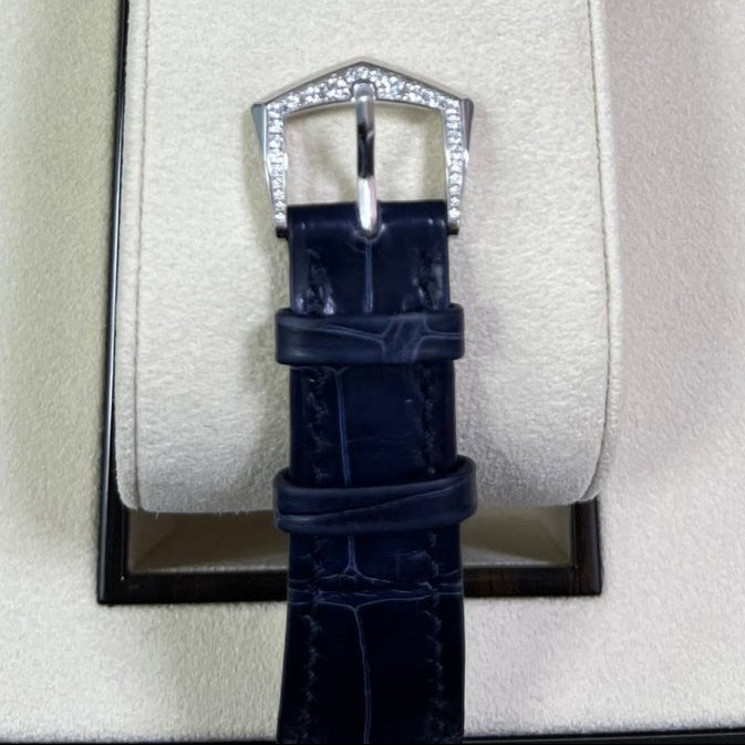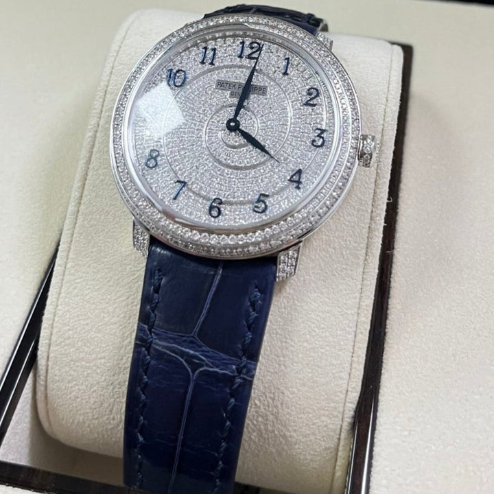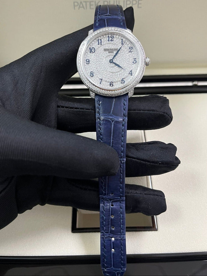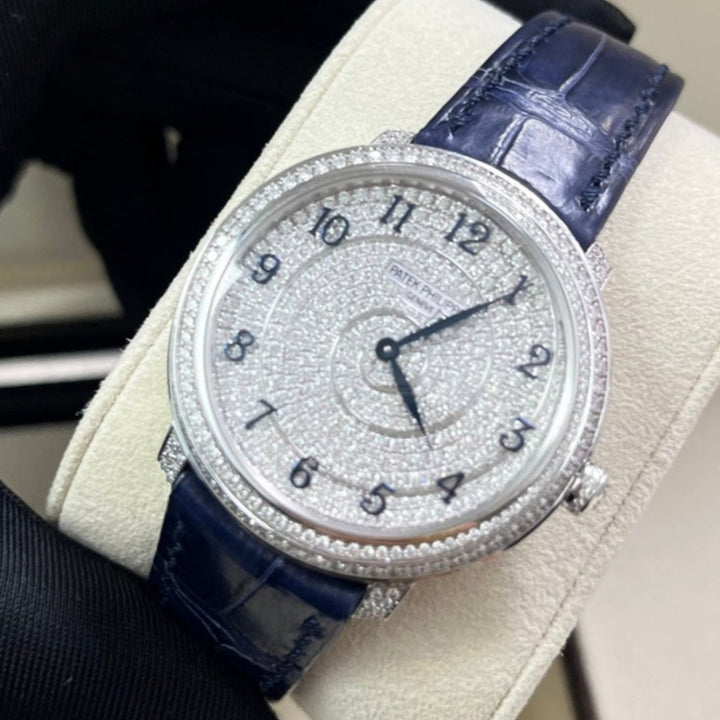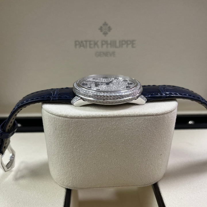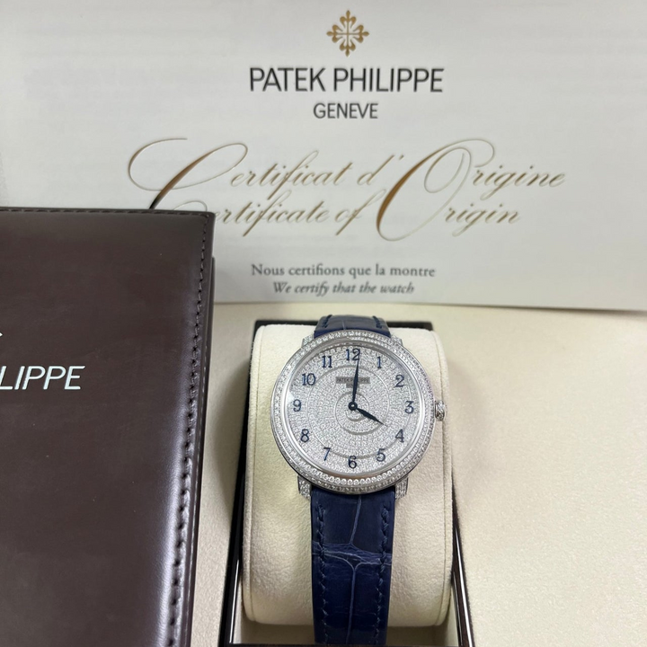 18kt white gold case with a blue alligator band. Fixed bezel with diamond set. Silver-tone dial with Arabic numeral hour markers. Dial Type: Analog. Patek Philippe Calibre 240 Automatic movement, containing 27 Jewels, composed of 161 parts, bitting at 21600 vph, and has a power reserve of approximately 48 hours. Scratch resistant sapphire crystal. Screw down crown. Transparent see through case back. Round case shape, case size: 36.5 mm, case thickness: 8.23 mm. Tang clasp. Water resistant at 30 meters / 100 feet. Functions: hour, minute. Calatrava Series. Luxury watch style. Watch label: Swiss Made.