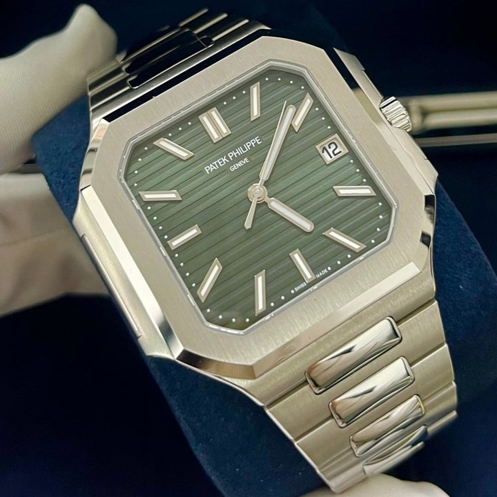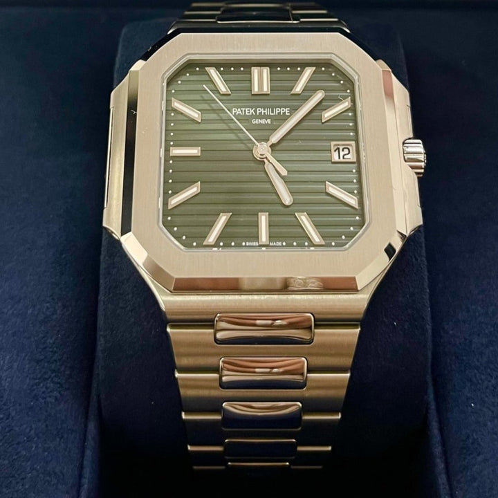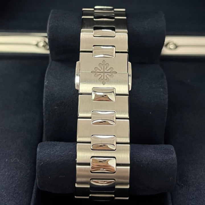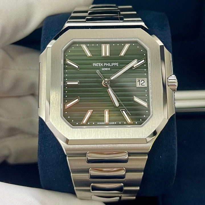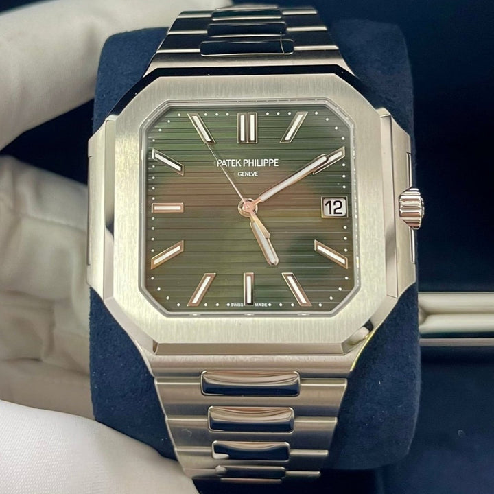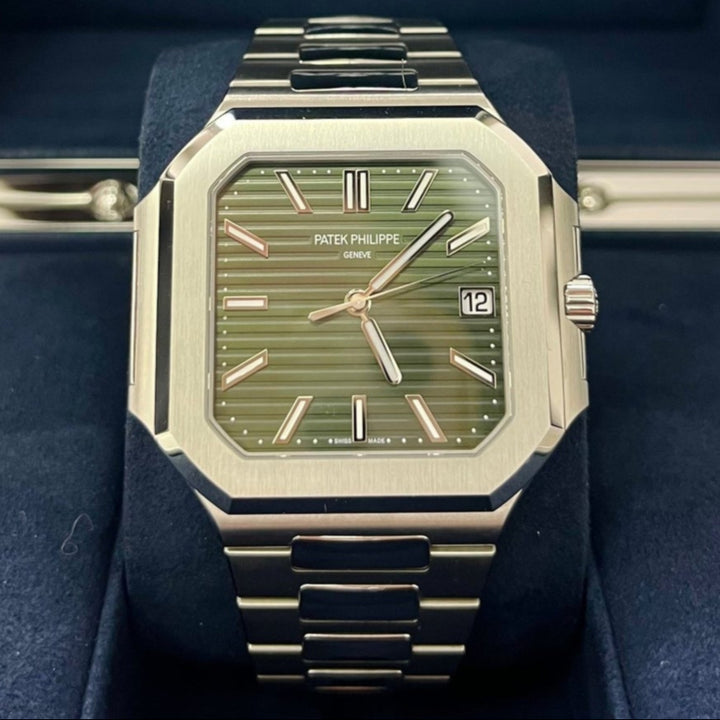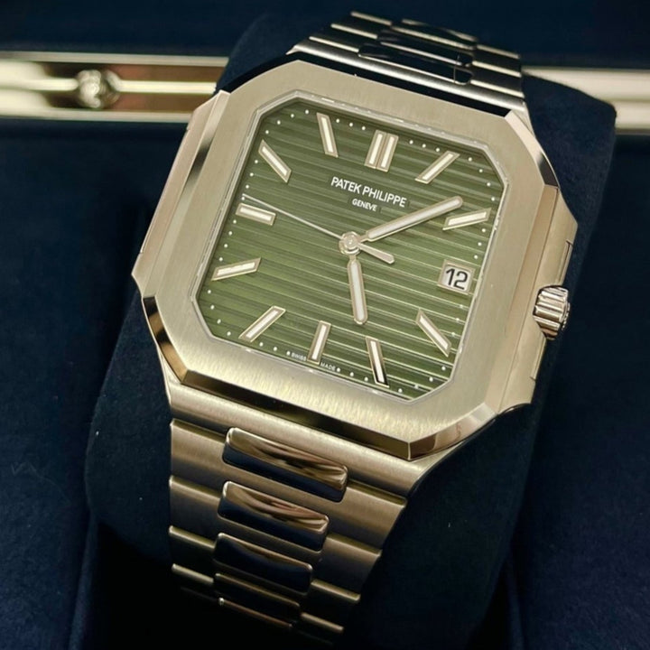 The new square case with its rounded edges is distinguished by its elegantly slim fit on the wrist. The horizontally embossed dial features an elegant sunburst olive green color. The steel bracelet is equipped with a lockable adjustment system and a patented Patek Philippe fold-over clasp ensuring both comfort and security.