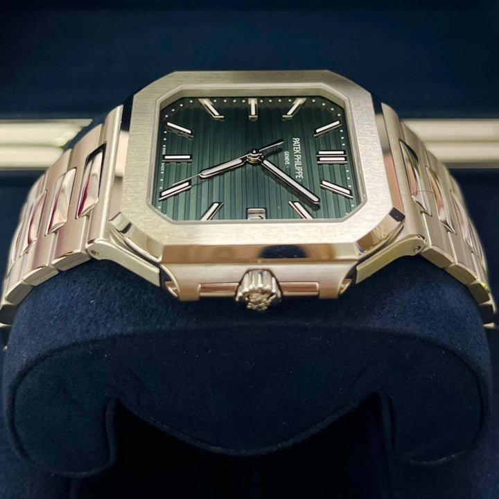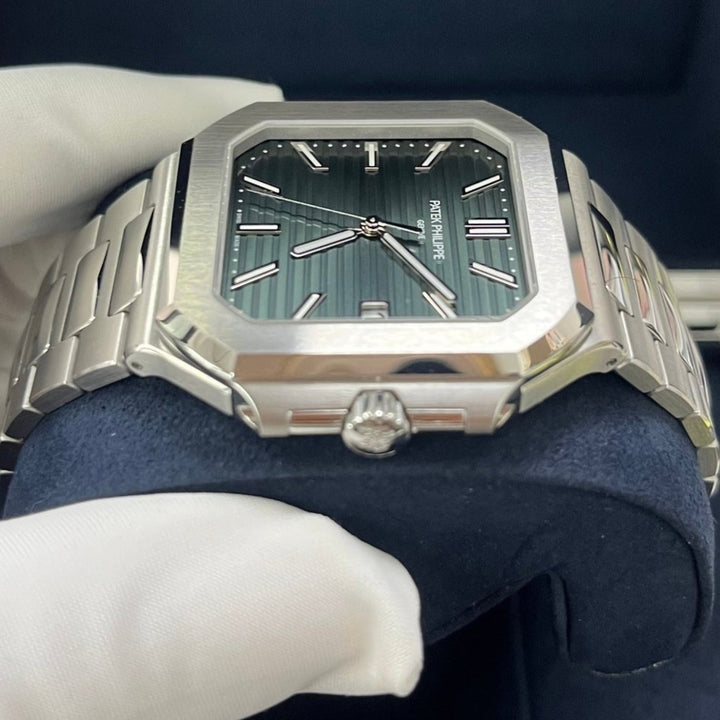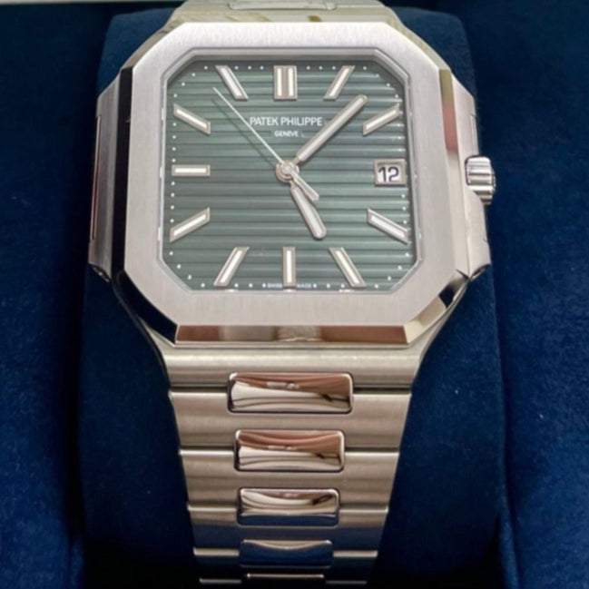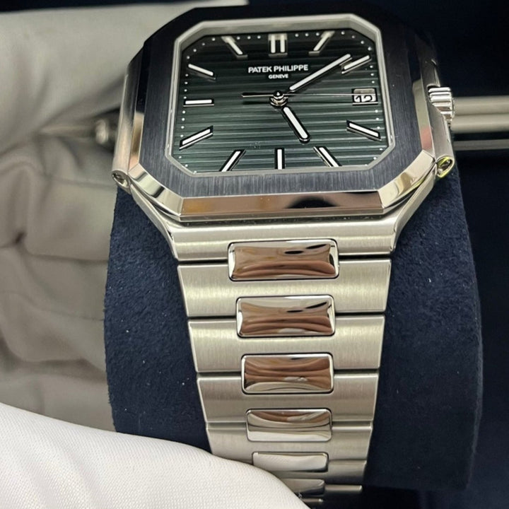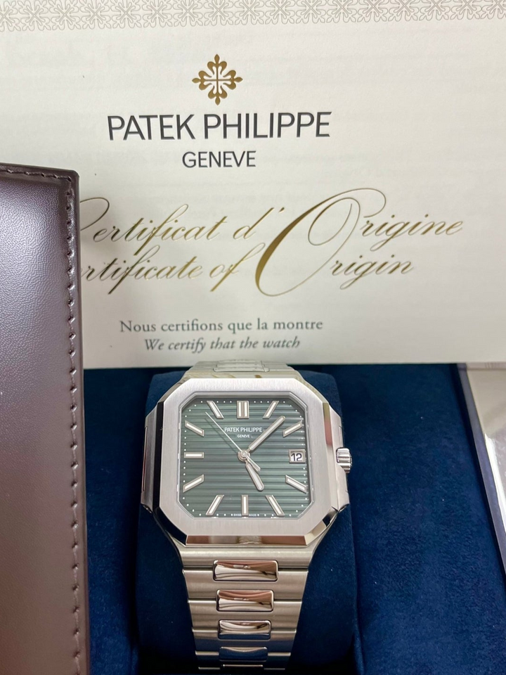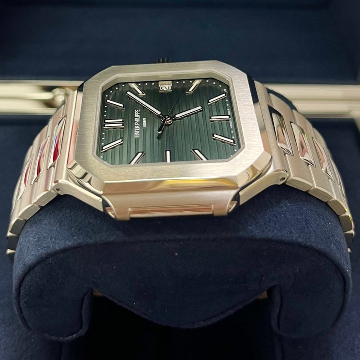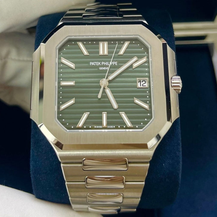 The new square case with its rounded edges is distinguished by its elegantly slim fit on the wrist. The horizontally embossed dial features an elegant sunburst olive green color. The steel bracelet is equipped with a lockable adjustment system and a patented Patek Philippe fold-over clasp ensuring both comfort and security.