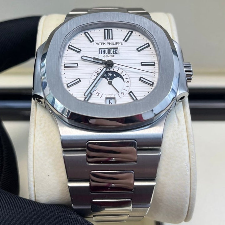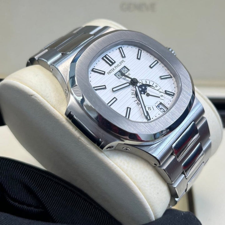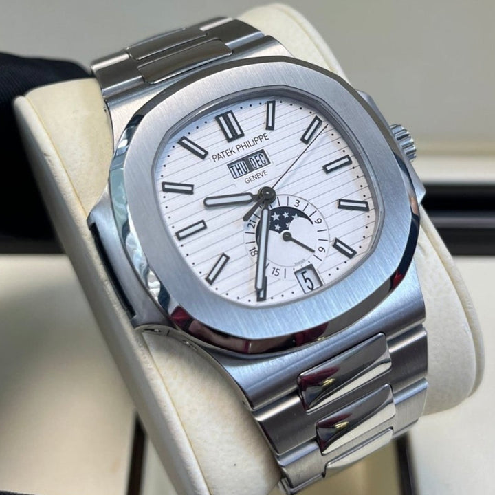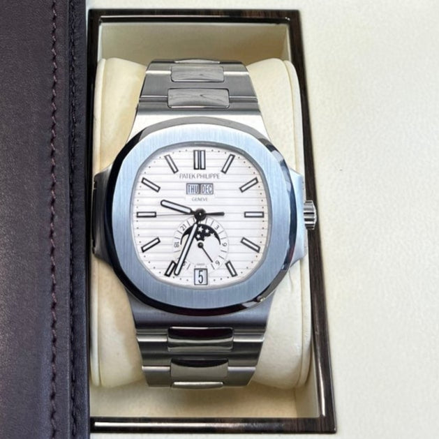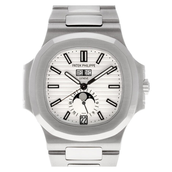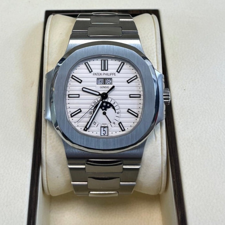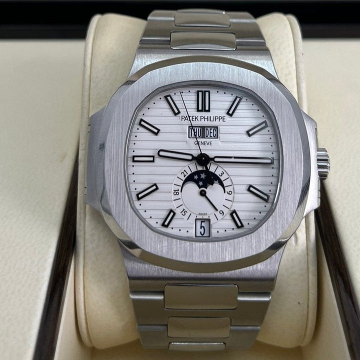 Patek Philippe Nautilus Annual Calendar (57261A010) self - winding automatic watch, features a 40.5mm stainless steel case surrounding a white dial on a stainless steel bracelet with folding buckle. Functions include hours, minutes, seconds, day, date, month and moon phase.
