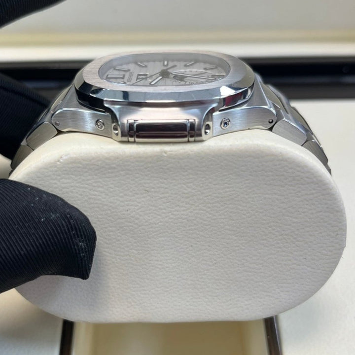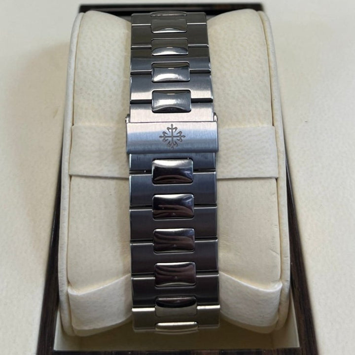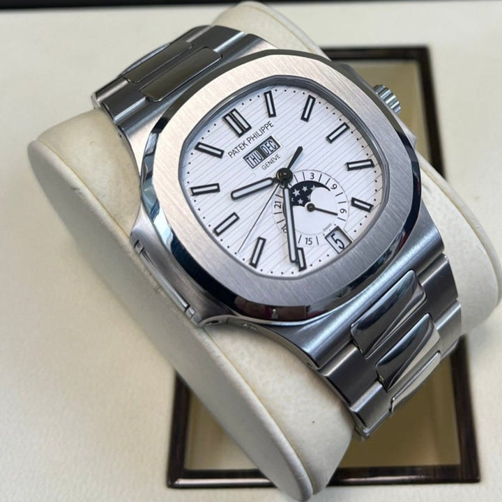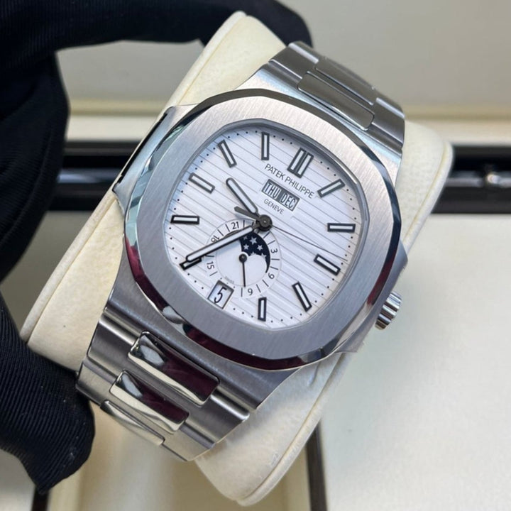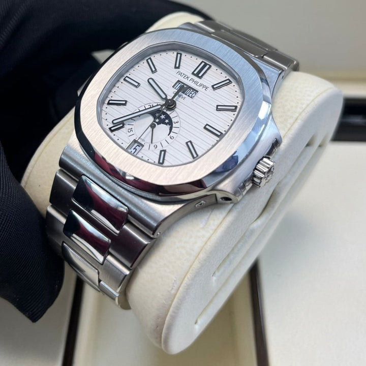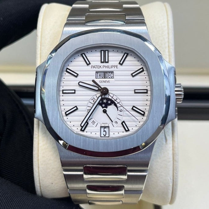 Patek Philippe Nautilus Annual Calendar (57261A010) self - winding automatic watch, features a 40.5mm stainless steel case surrounding a white dial on a stainless steel bracelet with folding buckle. Functions include hours, minutes, seconds, day, date, month and moon phase.