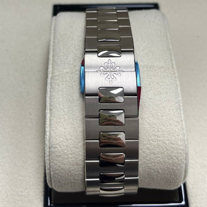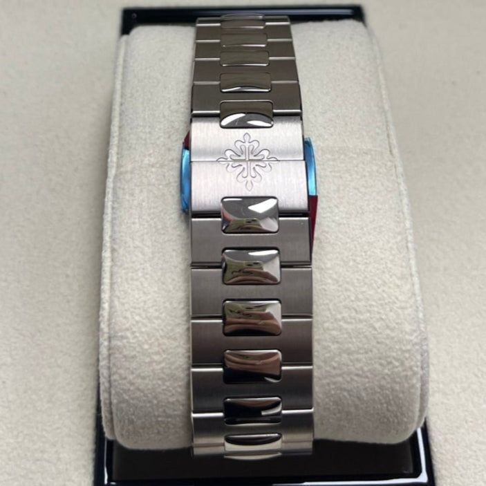 Water-resistant to 120 m and with a slightly enlarged diameter to 41 mm, the watch reflects its affinity with the original Nautilus of 1976 with a two-part case. It also features several subtle technical refinements and patented innovations: a secured fold-over clasp, a new lockable adjustment system, and a new pull-out piece lever system that replaces the split stem.