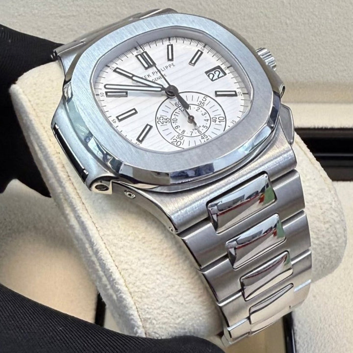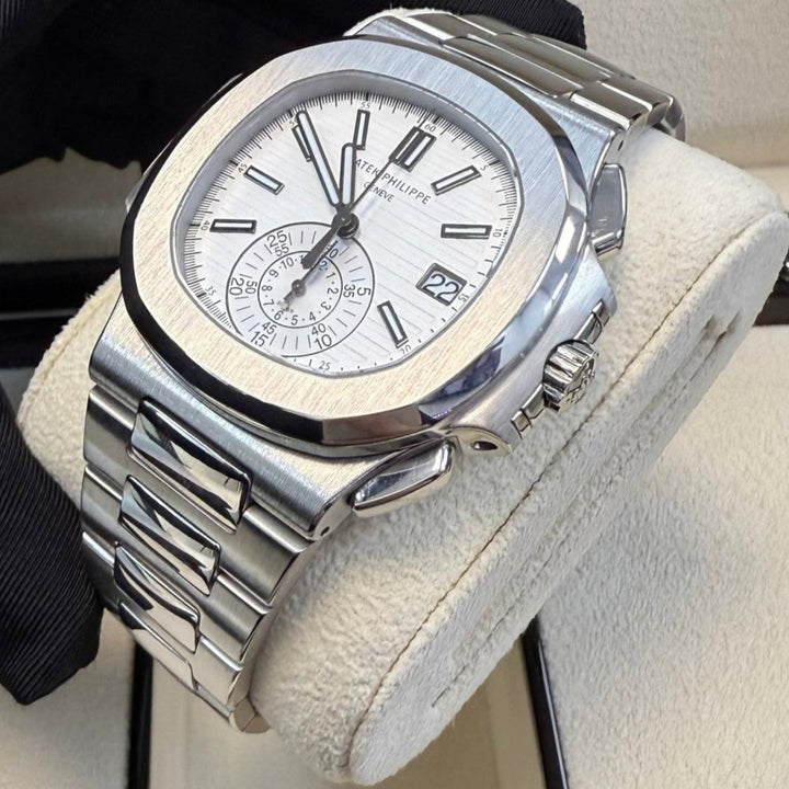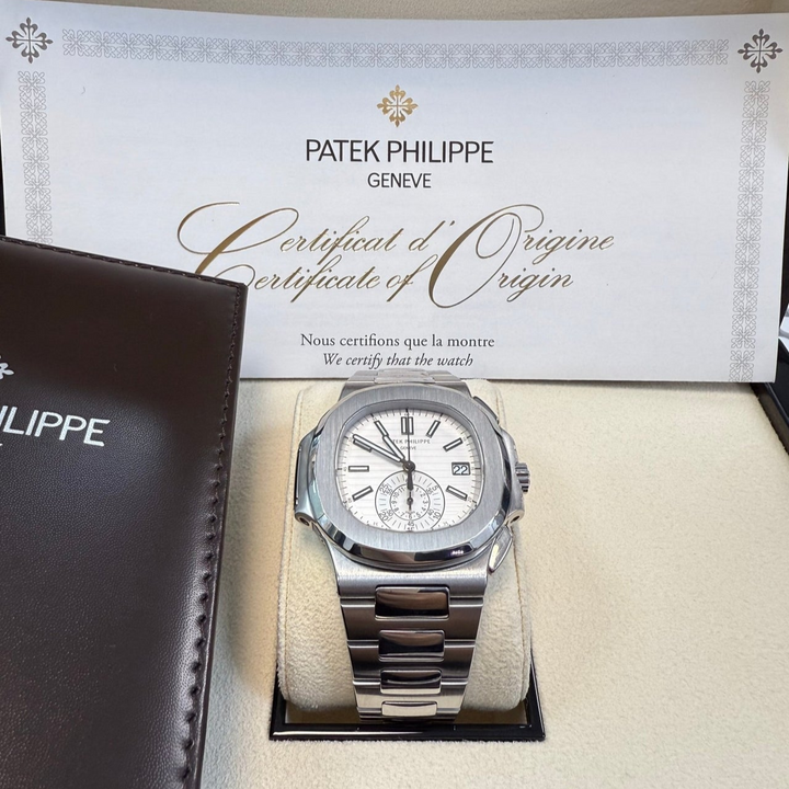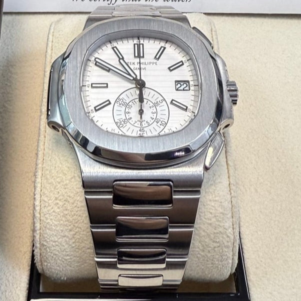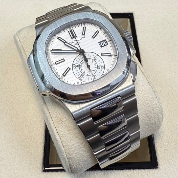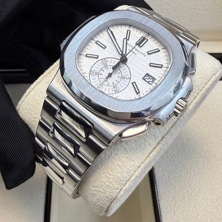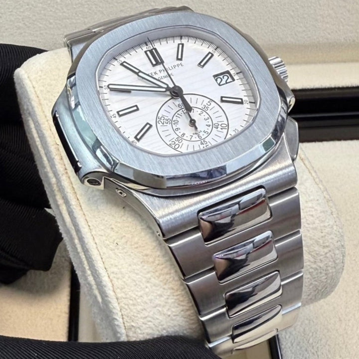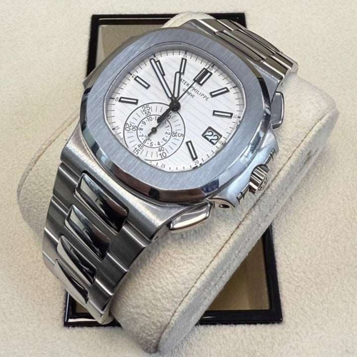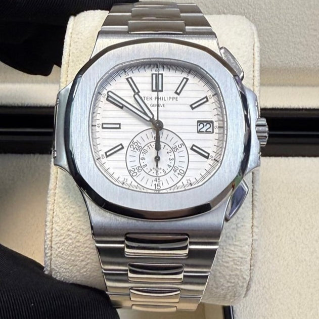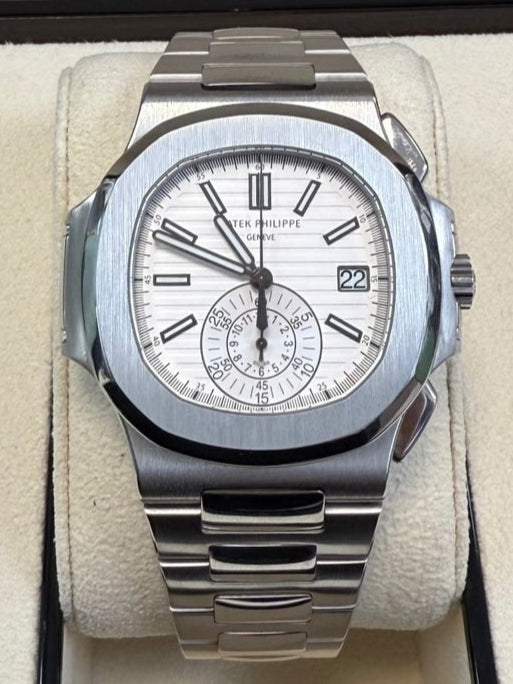Patek Philippe Nautilus Chronograph (ref. 5980/1A), featuring a mechanical automatic movement; white dial; chronograph complication with 60-minute and 12-hour counters together in a single elegant monocounter at 6 o'clock; date display at 3 o'clock; center sweep seconds hand, which also serves as the chronograph hand; and 40.5mm, stainless steel case with an integrated stainless steel, Nautilus-style bracelet.