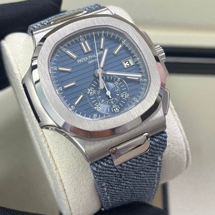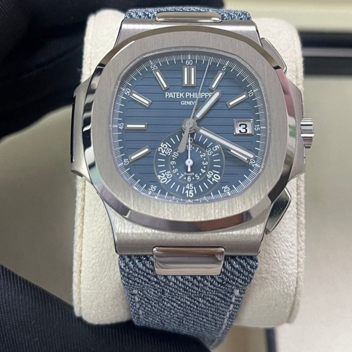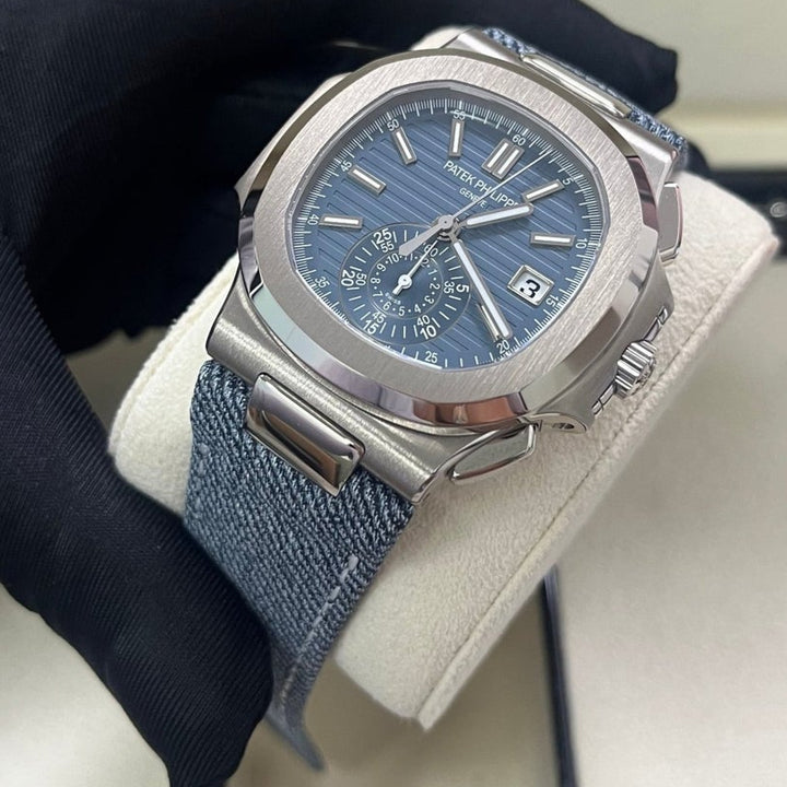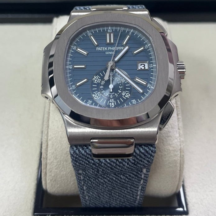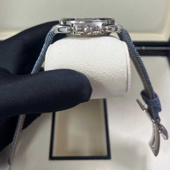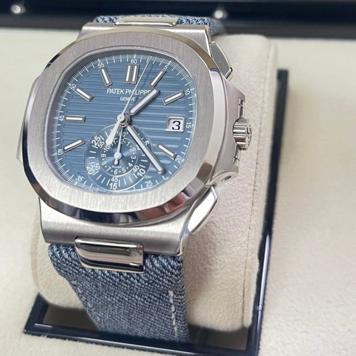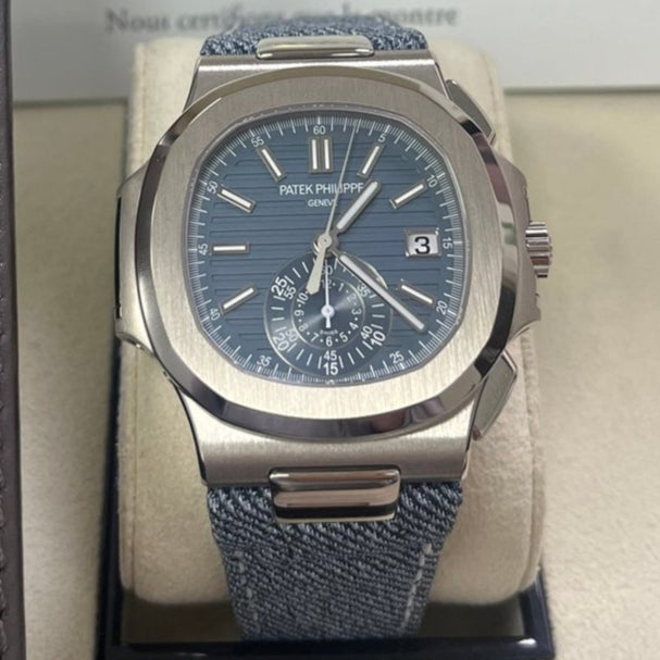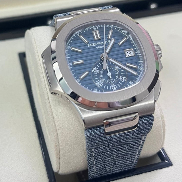 The Nautilus self-winding flyback chronograph comes in a new white gold version with an opaline blue-gray dial. This refined shade is echoed on the blue-gray denim-patterned calfskin strap with white gold Nautilus fold-over clasp. The watch is also delivered with an additional blue-gray composite material strap with fabric pattern.