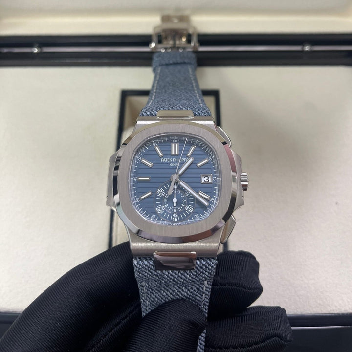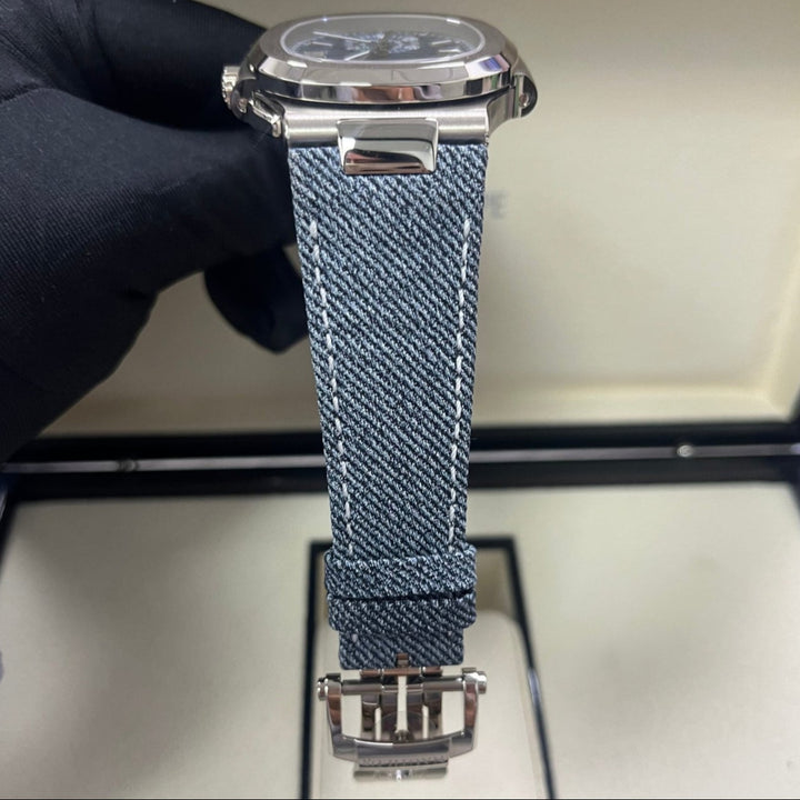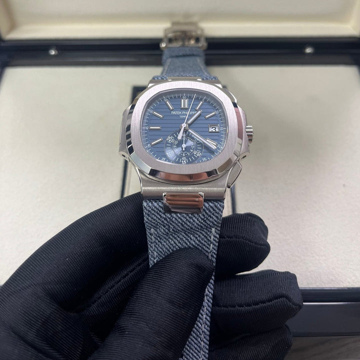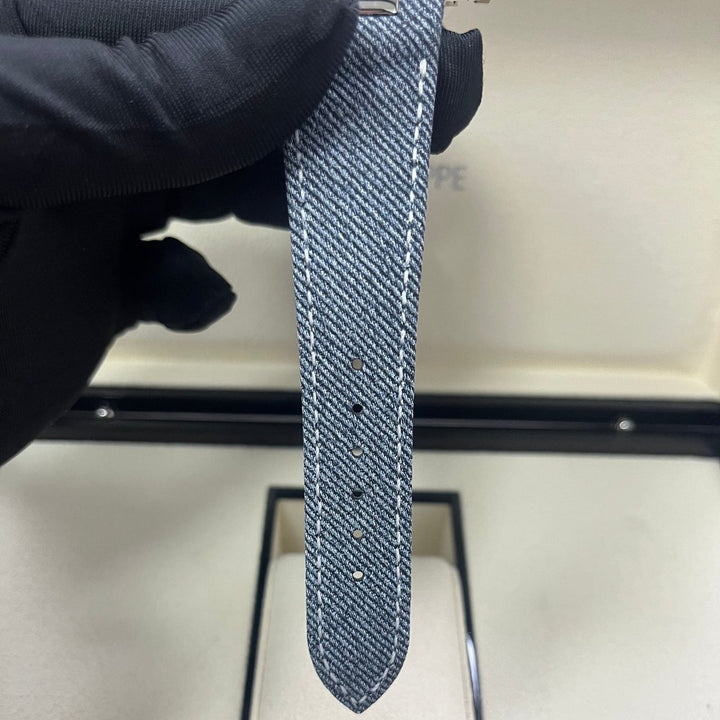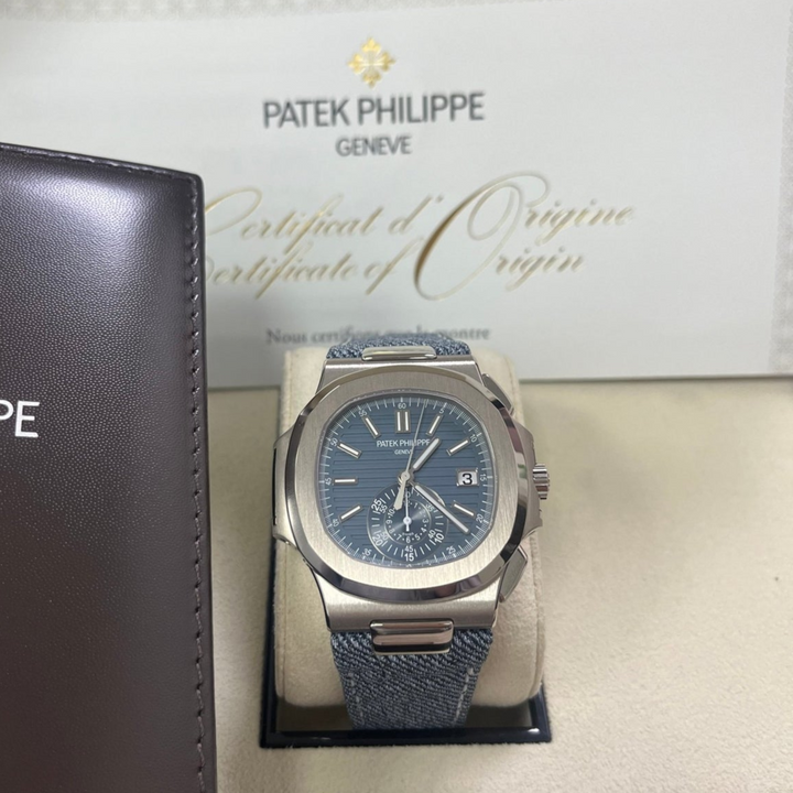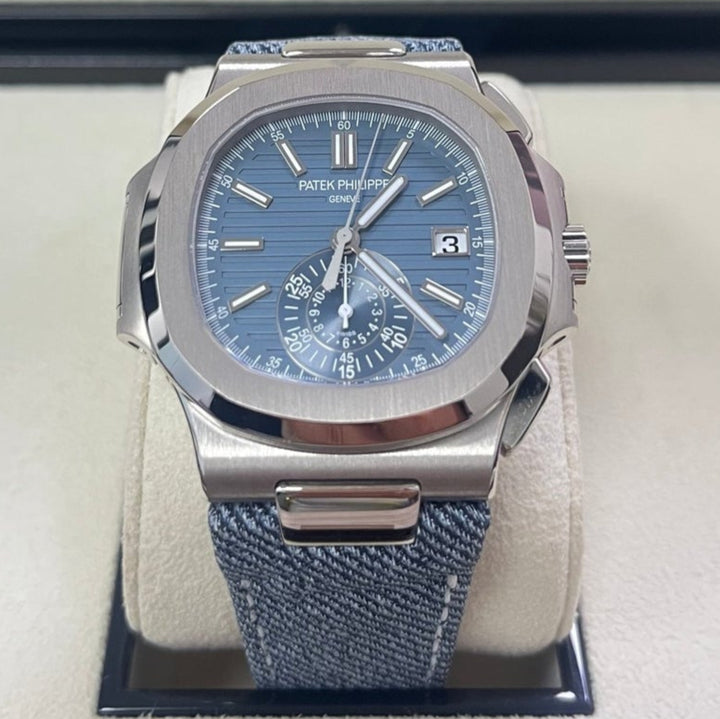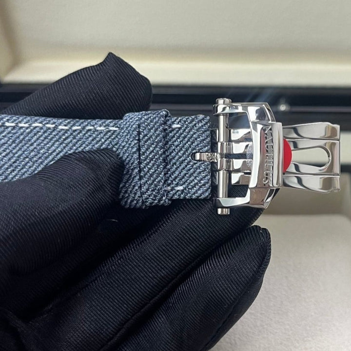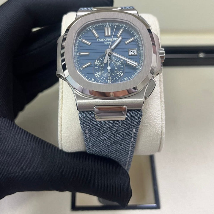 The Nautilus self-winding flyback chronograph comes in a new white gold version with an opaline blue-gray dial. This refined shade is echoed on the blue-gray denim-patterned calfskin strap with white gold Nautilus fold-over clasp. The watch is also delivered with an additional blue-gray composite material strap with fabric pattern.