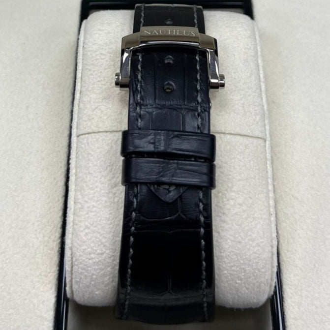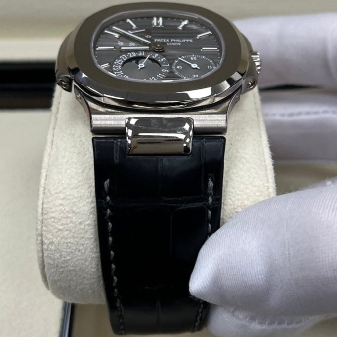 This Patek Philippe Nautilus 5712G is a masterpiece of design and functionality. This piece features a 40mm white gold case with the signature rounded octagonal bezel and ingenious porthole construction. The grey dial is horizontally embossed and accented with luminous hands and markers, ensuring it is easy to read in low light, like the back of a car or club.
