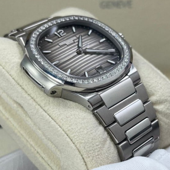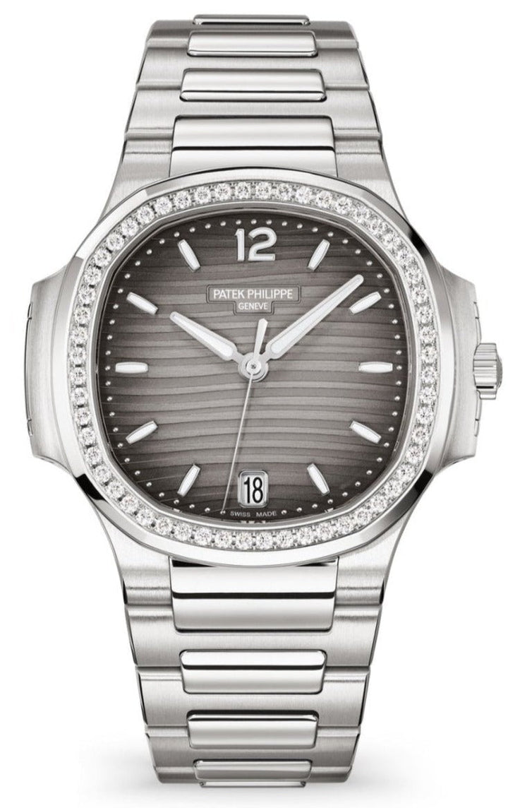 The Ladies Automatic Nautilus in steel with diamond-set bezel asserts its presence on the wrist with a slightly larger diameter (35.2 mm instead of 33.6 mm). Patek Philippe has also revised its range of dial colors, introducing blue opaline, silvery opaline or gray opaline, grading to black at the periphery.
