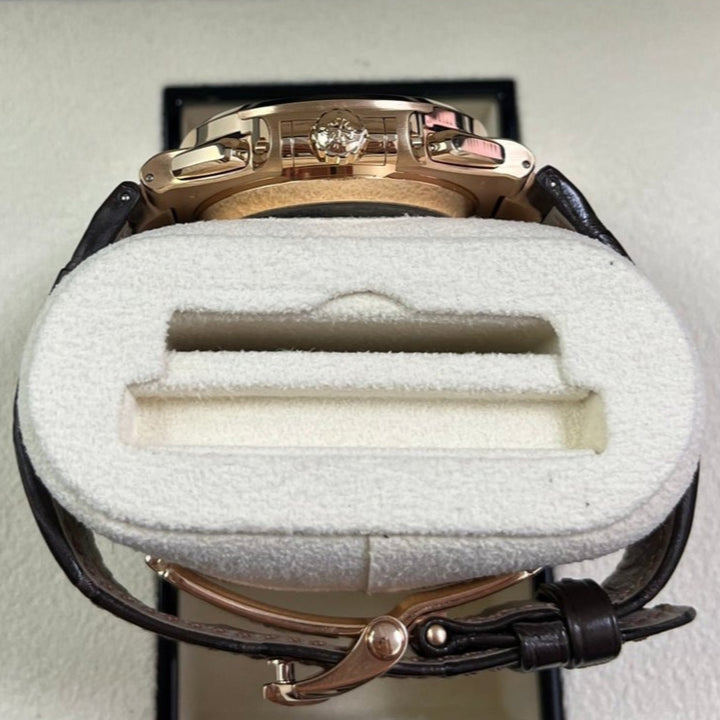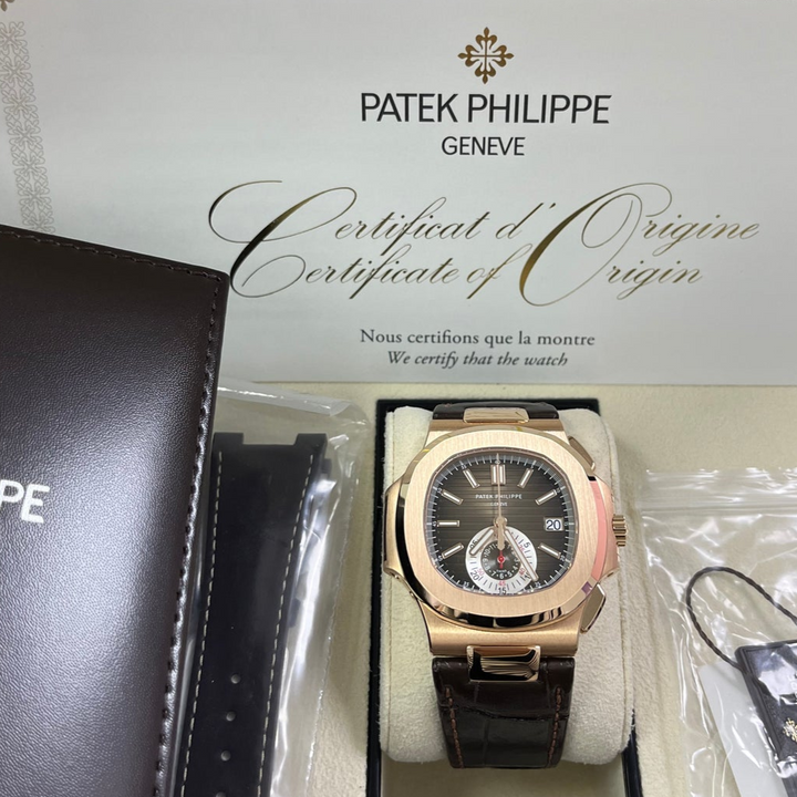 40.5mm 18K rose gold case, sapphire crystal back, screw-down crown, black-brown dial with gold applied hour markers with luminescent coating, self-winding caliber CH 28-520 C movement with 60-minute and 12-hour mono-counter chronograph and date, approximately 55 hours of power reserve, matt dark brown alligator strap with Nautilus fold-over buckle. Water-resistant up to 120 meters.