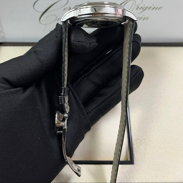 The perpetual calendar displays are harmoniously arranged, with the date indicated by a hand and a moon phase at 6 o’clock, as well as a twin day/month aperture at 12 o’clock, complemented by two round apertures for the day/night indication and the leap-year cycle. Caliber CH 29-535 PS Q is distinguished by its traditional architecture, combined with six patented innovations relating to the chronograph, as well as by its exceptionally thin calendar mechanism.