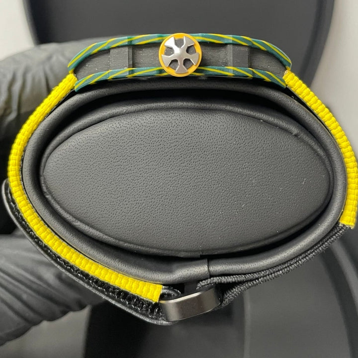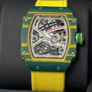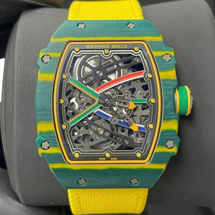 The Richard Mille RM 67-02 Wayde Van Niekerk is a masterpiece of lightweight engineering and design. Crafted from carbon TPT and quartz TPT in yellow and green, its 38.7 x 47.52mm case is only 7.8mm thick. The skeleton dial, featuring bridges hand-painted in the colors of the South African flag, showcases the calibre CRMA7 self-winding movement with a 50-hour power reserve. Finished with a yellow elastic comfort strap, this watch is designed for ultimate speed and wearability. Waterproof to 30 meters, it’s the perfect companion for athletes and collectors alike.