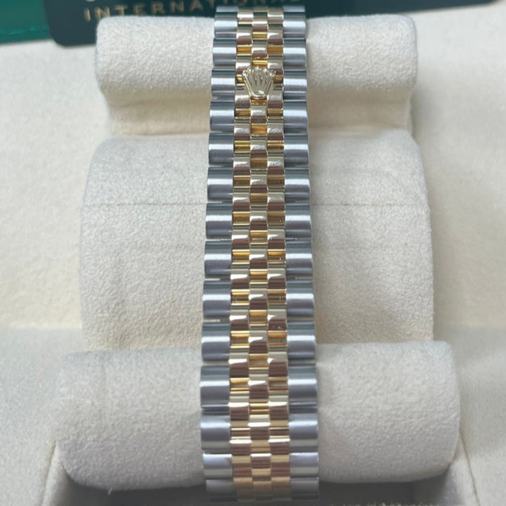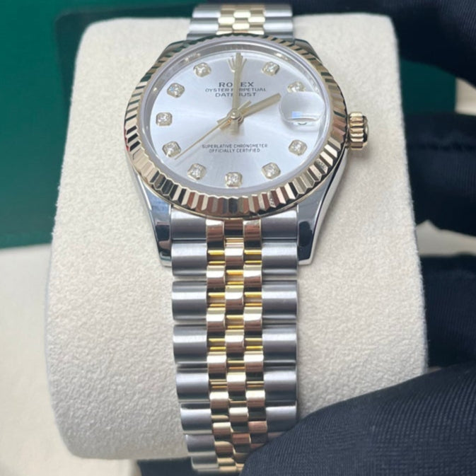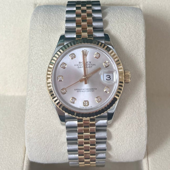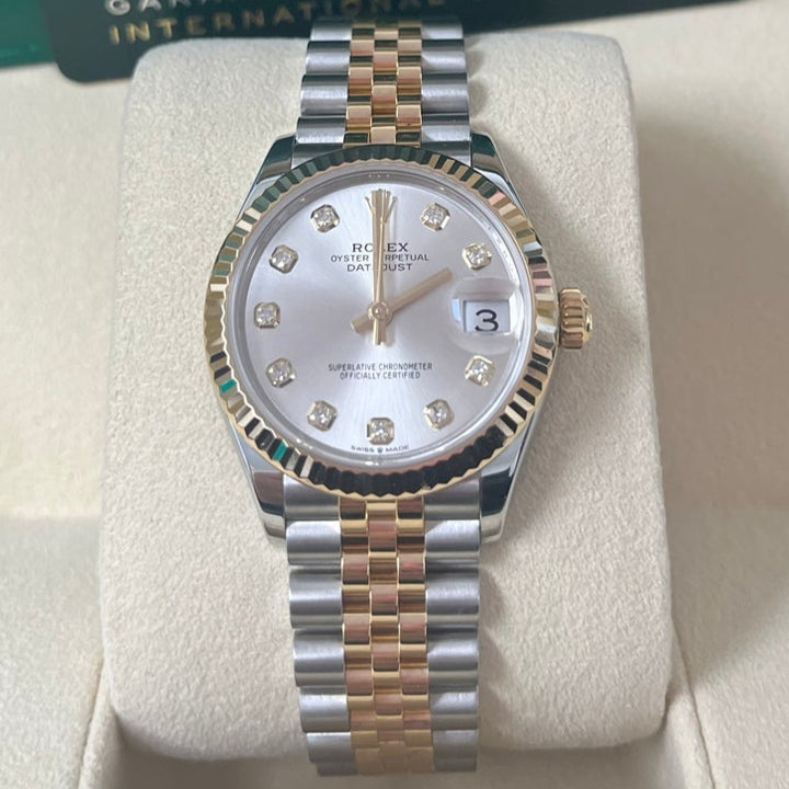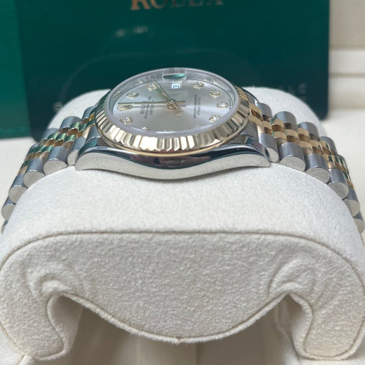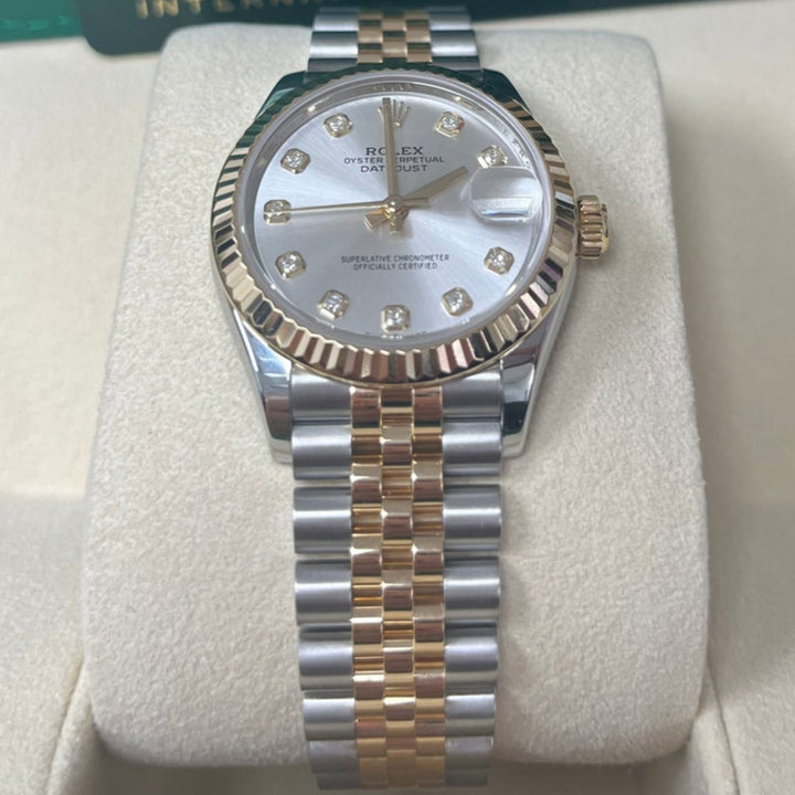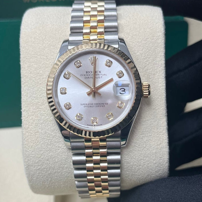31mm yellow Rolesor case comprised of Oystersteel and 18K yellow gold, screw-down back, screw-down crown with twinlock double waterproofness system, 18K yellow gold fluted bezel, scratch-resistant sapphire crystal with cyclops lens over the date, silver dial, diamond hour markers, Rolex calibre 2236 perpetual self-winding movement with date at 3 o'clock, approximately 55 hours of power reserve, yellow Rolesor Jubilee bracelet with semi-circular three-piece links, concealed folding Crownclasp buckle. Waterproof to 100 meters.