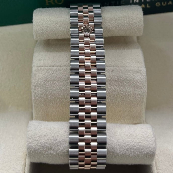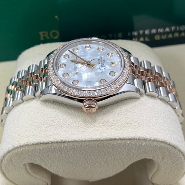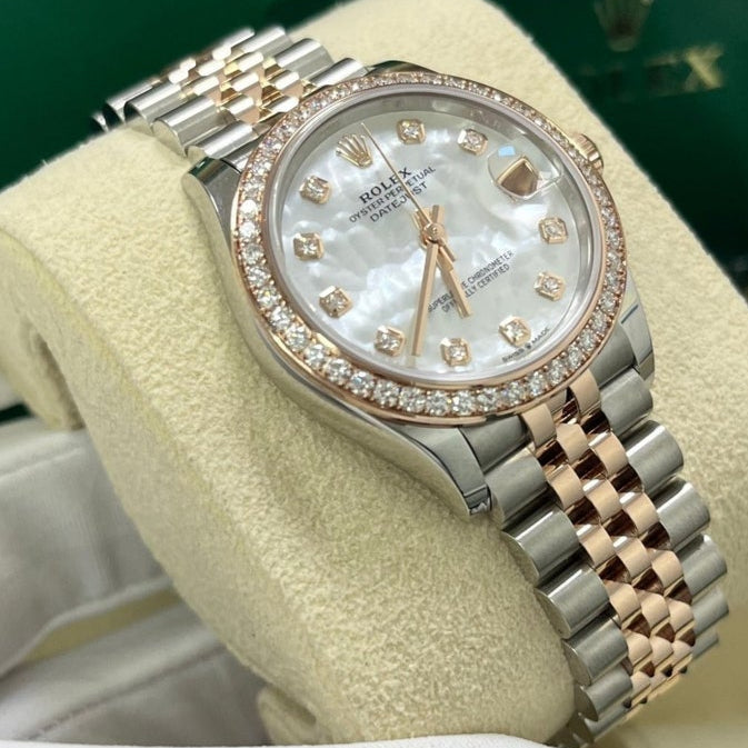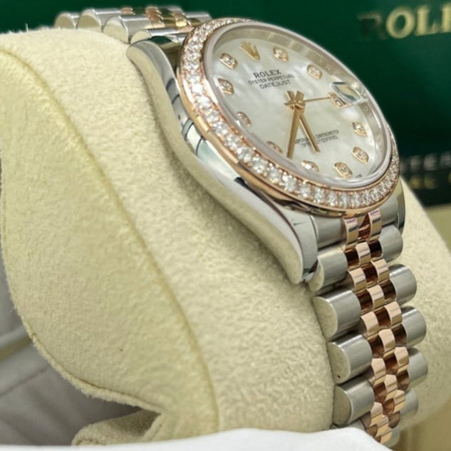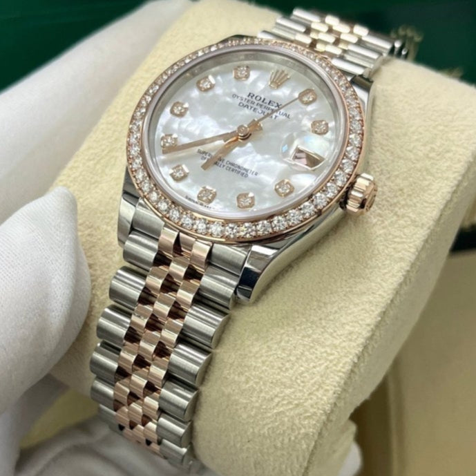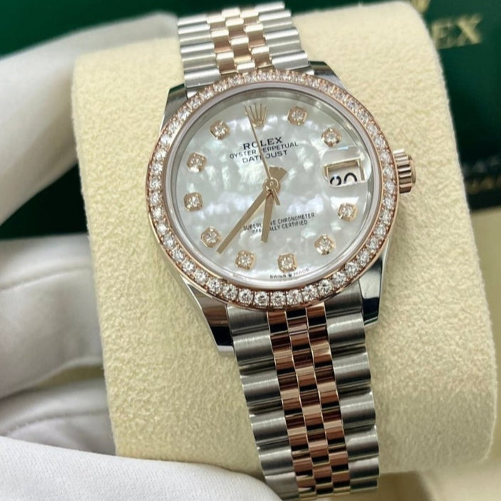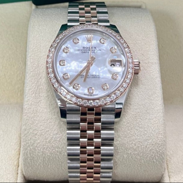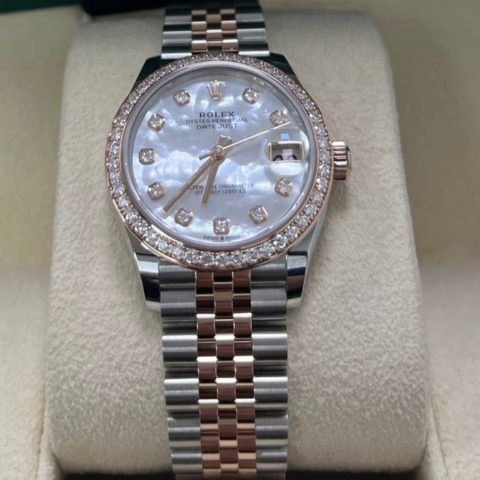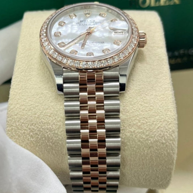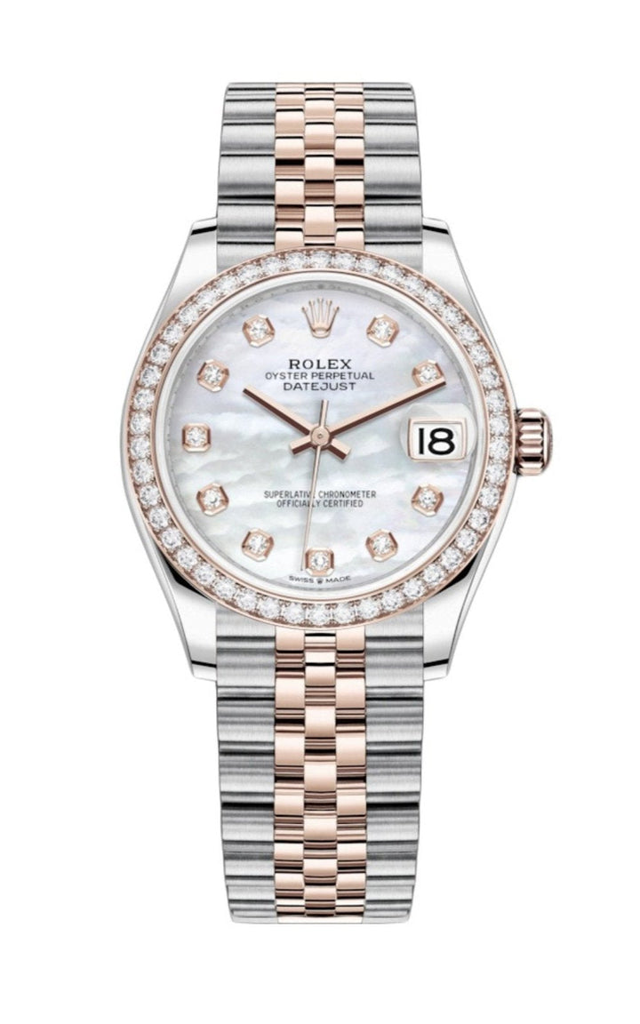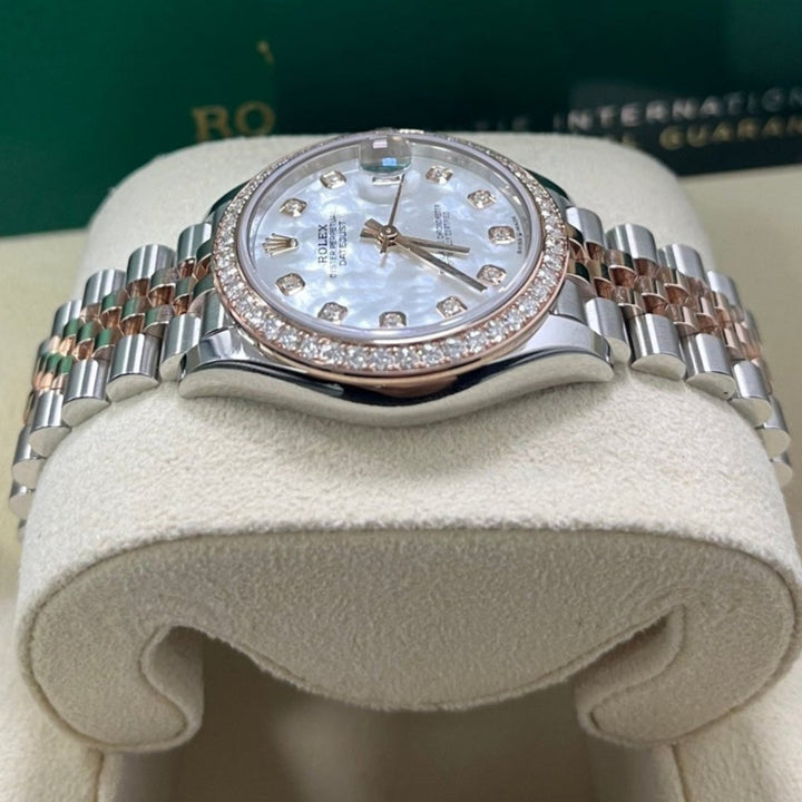 31mm Everose Rolesor case comprised of Oystersteel and 18K Everose gold, screw-down back, screw-down crown with twinlock double waterproofness system, 18K Everose gold bezel set with 46 diamonds, scratch-resistant sapphire crystal with cyclops lens over the date, white mother-of-pearl dial, diamond hour markers, Rolex calibre 2236 perpetual self-winding movement with date at 3 o'clock, approximately 55 hours of power reserve, Everose Rolesor Jubilee bracelet with semi-circular three-piece links, concealed folding Crownclasp buckle. Waterproof to 100 meters.