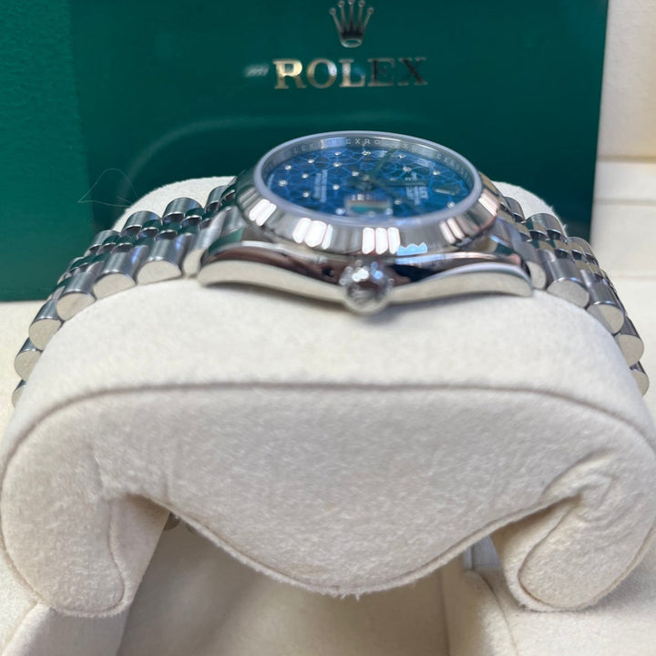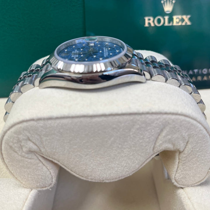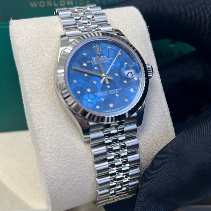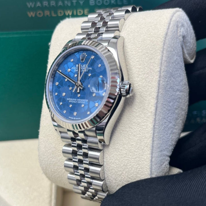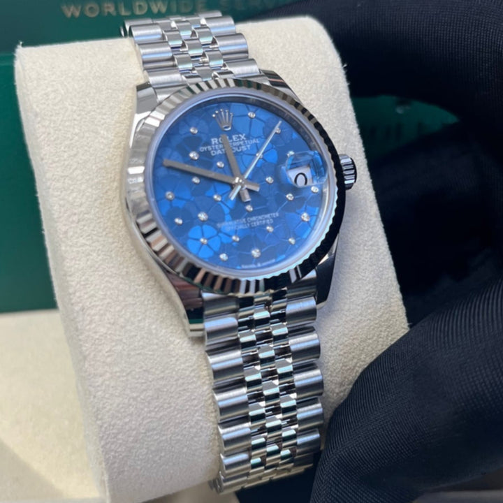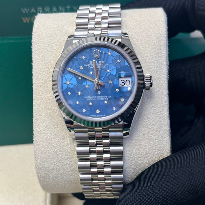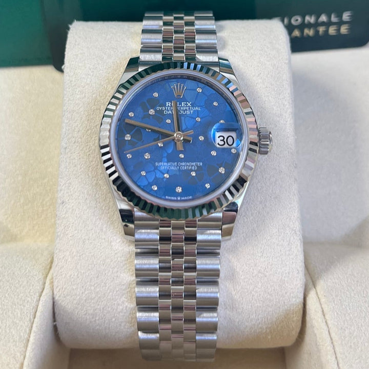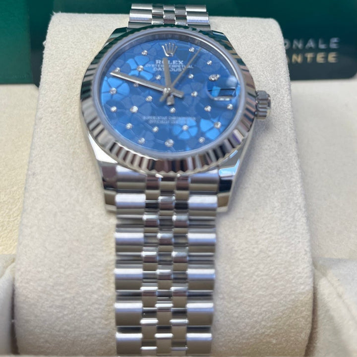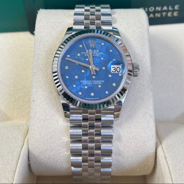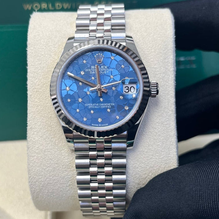 31mm white Rolesor case comprised of Oystersteel and white gold, screw-down back, screw-down crown with twinlock double waterproofness system, fluted bezel, scratch-resistant sapphire crystal with cyclops lens over the date, azzurro blue floral motif dial set with 24 diamonds, Rolex calibre 2236 perpetual self-winding movement with centre hour, minute and seconds hands, instantaneous date with rapid setting, and stop-seconds for precise time setting, approximately 55 hours of power reserve,