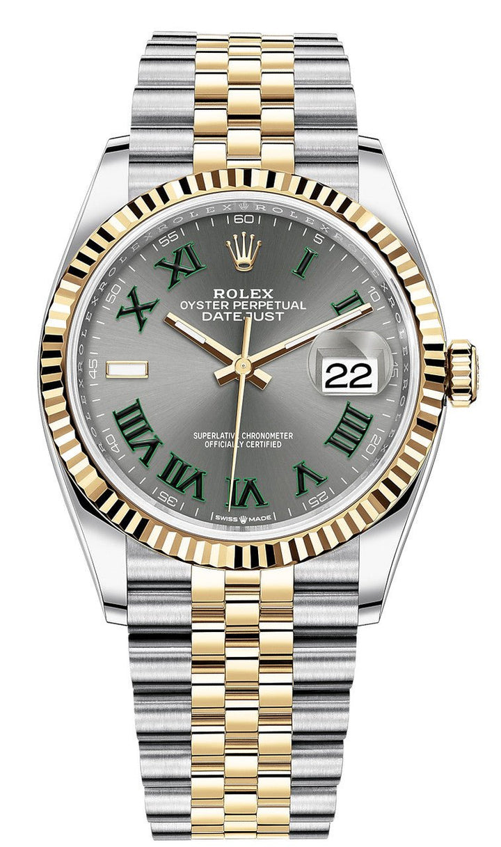 36mm yellow Rolesor case comprised of Oystersteel and yellow gold, screw-down back, screw-down crown with twinlock double waterproofness system, fluted bezel, scratch-resistant sapphire crystal with cyclops lens over the date, slate dial, green Roman numerals, Rolex calibre 3235 perpetual self-winding movement with centre hour, minute and seconds hands, instantaneous date with rapid setting, and stop-seconds for precise time setting, approximately 70 hours of power reserve, Jubilee bracelet with five-piece links, folding Oysterclasp buckle with Easylink 5mm comfort extension link. Waterproof to 100 metres / 330 feet.