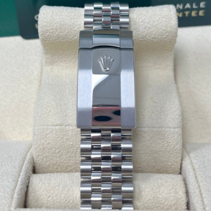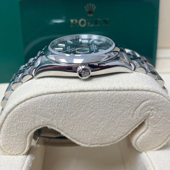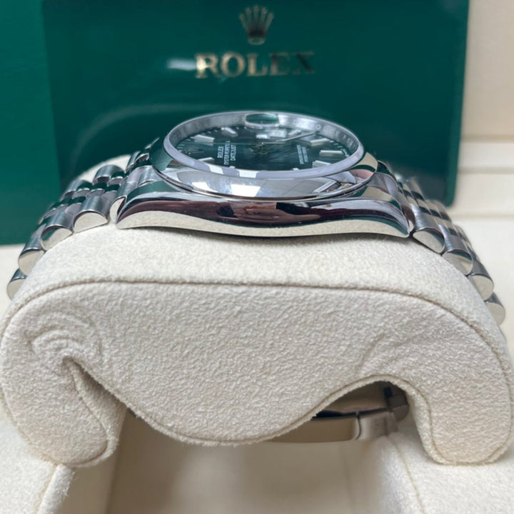 36mm Oystersteel case, screw-down back, screw-down crown with twinlock double waterproofness system, domed bezel, scratch-resistant sapphire crystal with cyclops lens over the date, mint green dial, index hour markers, Rolex calibre 3235 perpetual self-winding movement with centre hour, minute and seconds hands, instantaneous date with rapid setting, and stop-seconds for precise time setting, approximately 70 hours of power reserve, Jubilee bracelet with five-piece links, folding Oysterclasp buckle