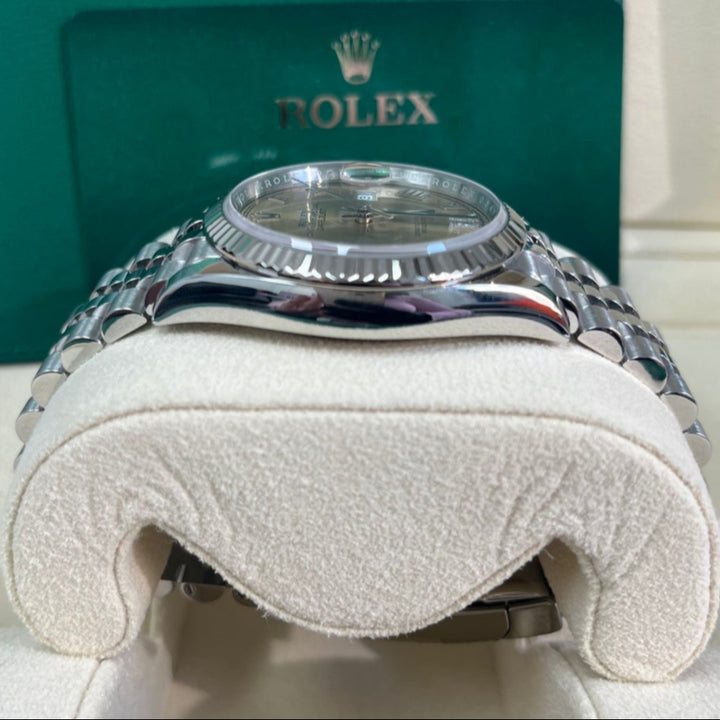 Stainless steel and 18k white gold case with a stainless steel Rolex jubilee bracelet. Fixed fluted stainless steel and 18kt white gold fluted bezel.
