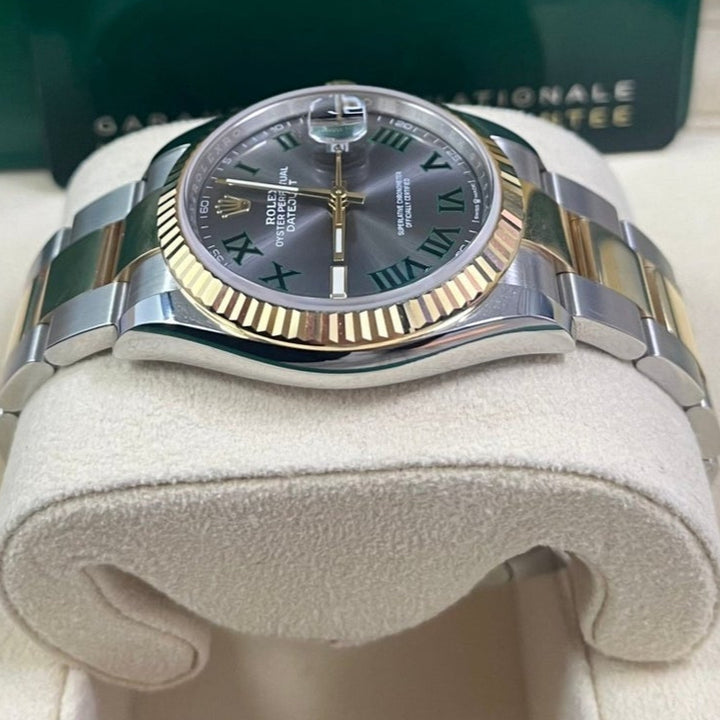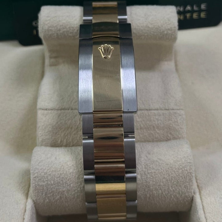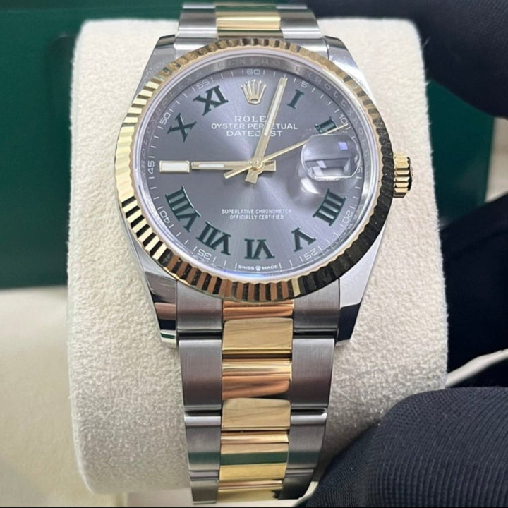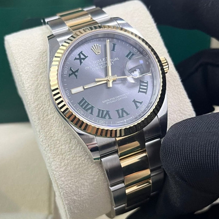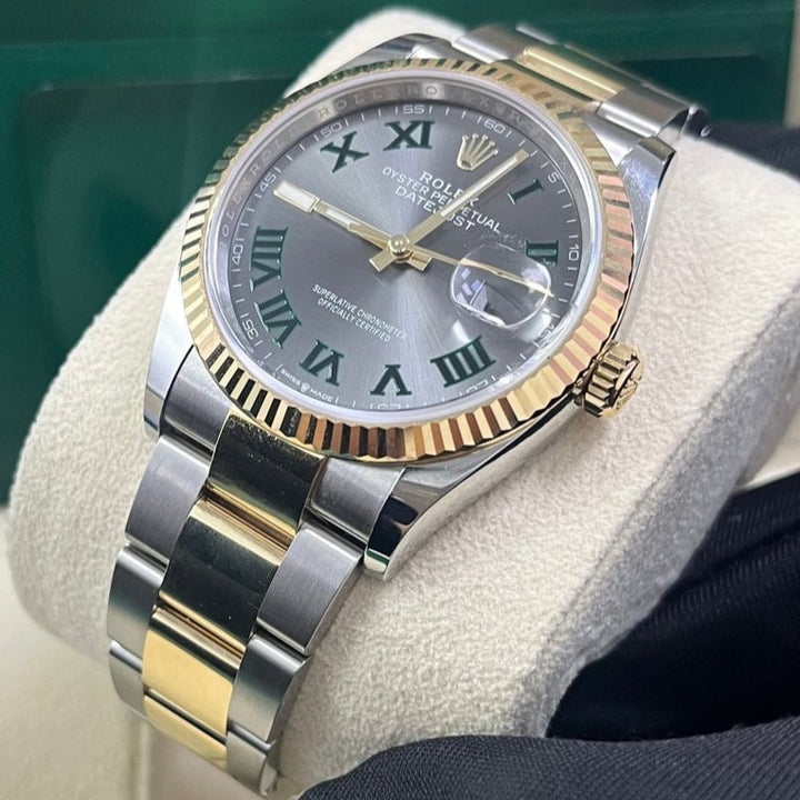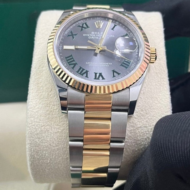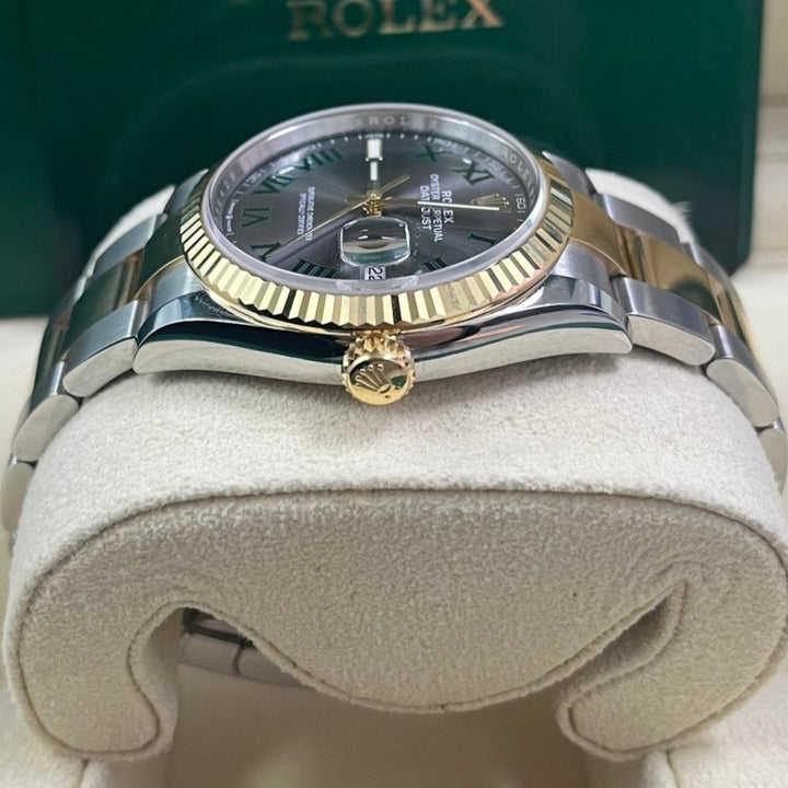 36mm yellow Rolesor case comprised of Oystersteel and yellow gold, screw-down back, screw-down crown with twinlock double waterproofness system, fluted bezel, scratch-resistant sapphire crystal with cyclops lens over the date, slate dial, green Roman numerals, Rolex calibre 3235 perpetual self-winding movement with centre hour, minute and seconds hands, instantaneous date with rapid setting, and stop-seconds for precise time setting, approximately 70 hours of power reserve, Oyster bracelet with flat three-piece links, folding Oysterclasp buckle with Easylink 5mm comfort extension link. Waterproof to 100 metres / 330 feet.