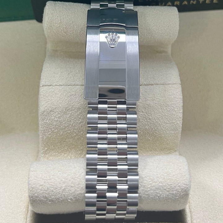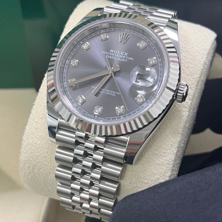 41mm white Rolesor case comprised of a 904L steel monobloc middle case, screw-down steel back, screw-down crown with twinlock double waterproofness system, 18K white gold fluted bezel, scratch-resistant double anti-reflective sapphire crystal with cyclops lens over the date, dark rhodium dial, 10 diamond hour markers, Rolex calibre 3235 perpetual self-winding movement with date at 3 o'clock that changes instantaneously at midnight in a few thousandths of a second, approximately 70 hours of power reserve, 904L steel Jubilee bracelet with five-piece links, folding Oysterclasp buckle with Easylink 5mm comfort extension link. Waterproof to 100 meters. 2020.