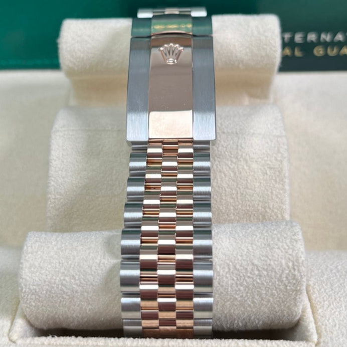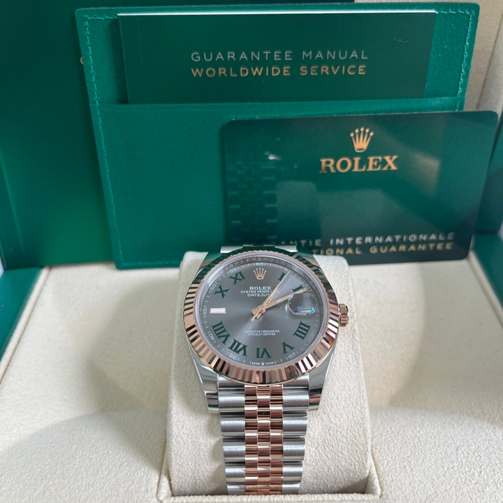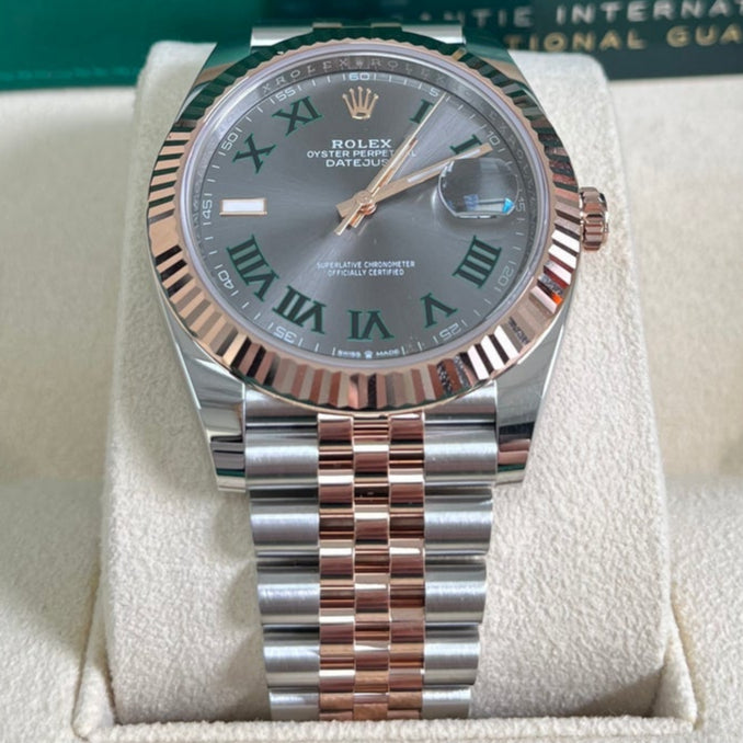 41mm Everose Rolesor case with 904L steel monobloc middle case, screw-down steel back, 18K Everose gold screw-down crown, 18K Everose gold fluted bezel, scratch-resistant double anti-reflective sapphire crystal with cyclops lens over the date, slate-gray dial, green Roman numerals. Rolex caliber 3235 perpetual self-winding movement with date at 3 o'clock that changes instantaneously at midnight in a few thousandths of a second, approximately 70 hours of power reserve, Everose Rolesor Jubilee bracelet made from a combination of 904L steel and 18K Everose gold with five-piece links, folding Oyster-Clasp buckle with Easylink 5mm comfort extension link. Water-resistant up to 100 meters.