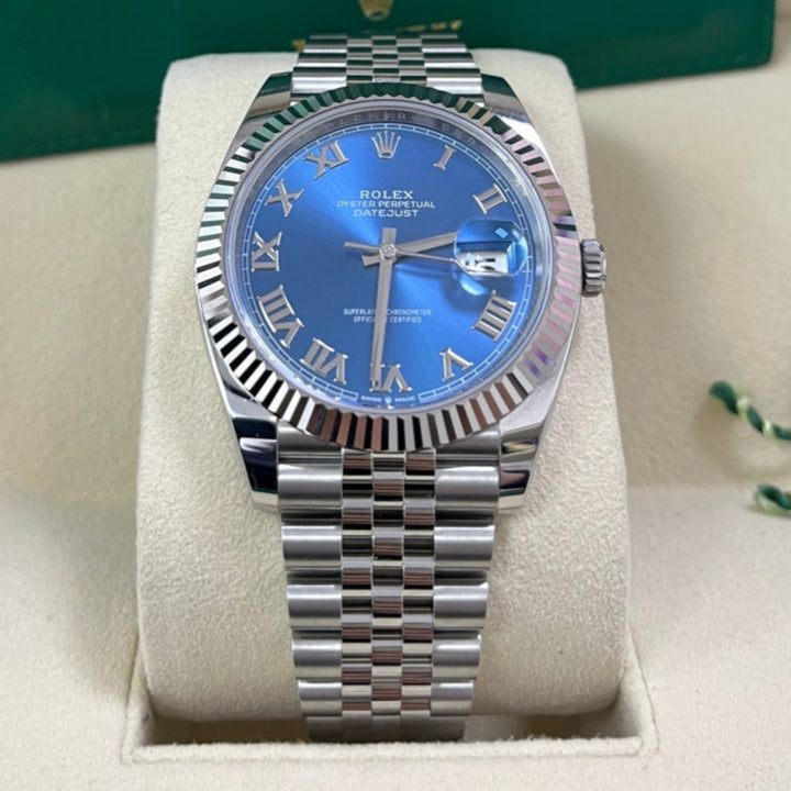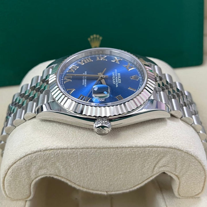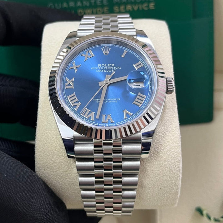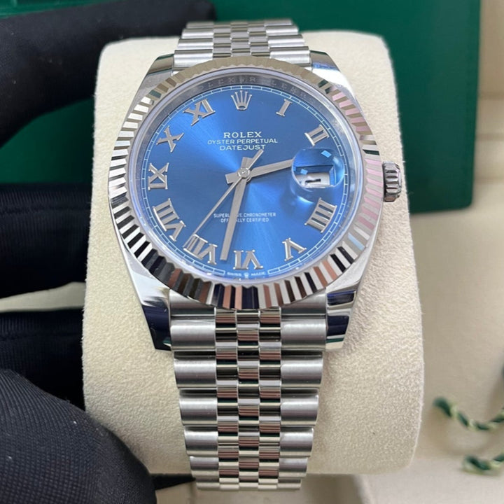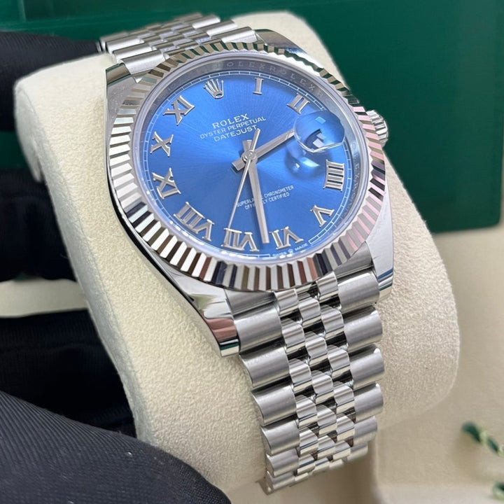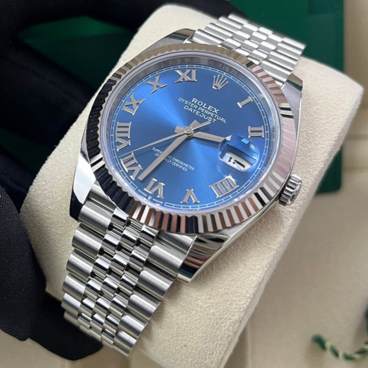 The Rolex Datejust 41 Blue Roman Dial (Reference 126334) is the classic Rolex DateJust, now available in this larger 41mm case size. Crafted with White Rolesor, a harmonious combination of 904L Oystersteel and 18K white gold, this watch exudes sophistication for any occasion while also being wearable as a daily watch.