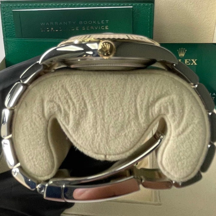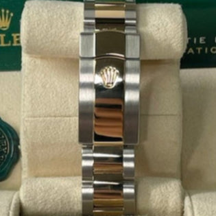 41mm Yellow Rolesor case with 904L steel monobloc middle case, screw-down steel back, 18K yellow gold screw-down crown, 18K yellow gold fluted bezel, scratch-resistant double anti-reflective sapphire crystal with cyclops lens over the date, champagne dial, diamond hour markers, Rolex calibre 3235 perpetual self-winding movement with date at 3 o'clock that changes instantaneously at midnight in a few thousandths of a second, approximately 70 hours of power reserve, yellow Rolesor oyster bracelet made from a combination of 904L steel and 18K yellow gold with five-piece links, folding Oysterclasp buckle with Easylink 5mm comfort extension link. Waterproof to 100 meters. 2020.