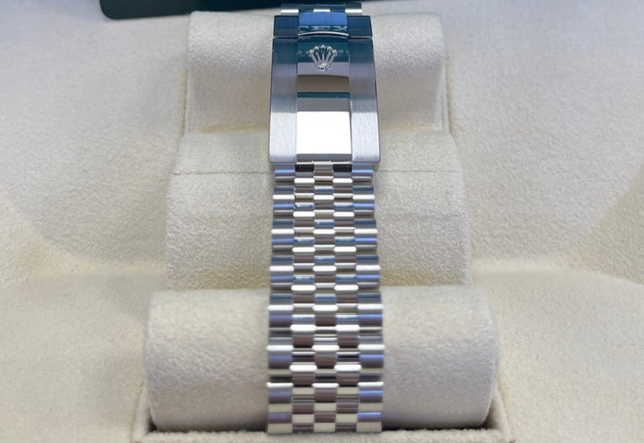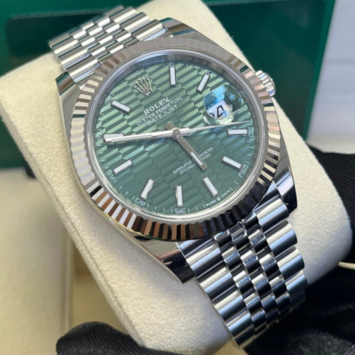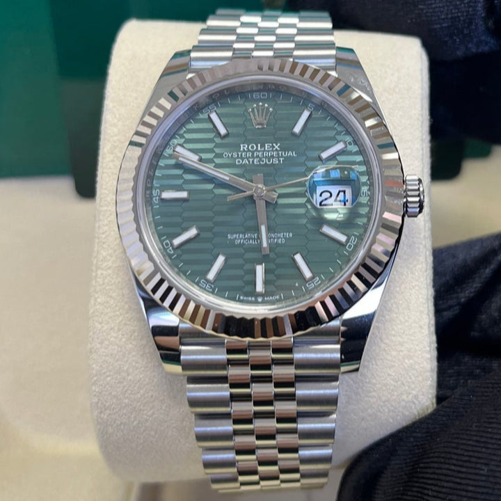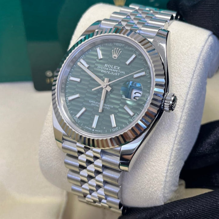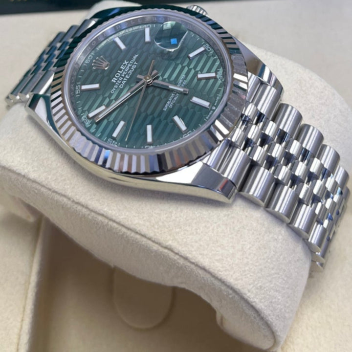 41mm white Rolesor case comprised of Oystersteel and white gold, screw-down back, screw-down crown with twinlock double waterproofness system, fluted bezel, scratch-resistant sapphire crystal with cyclops lens over the date, mint green fluted motif dial, index hour markers, Rolex calibre 3235 perpetual self-winding movement with centre hour, minute and seconds hands, instantaneous date with rapid setting, and stop-seconds for precise time setting, approximately 70 hours of power reserve, Jubilee bracelet with five-piece links, folding Oysterclasp buckle with Easylink 5mm comfort extension link. Waterproof to 100 metres / 330 feet.