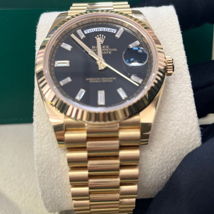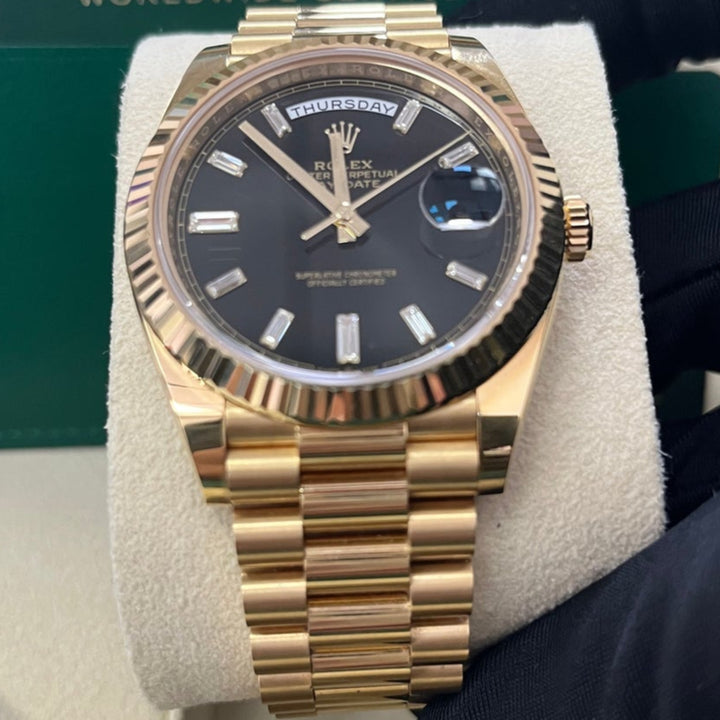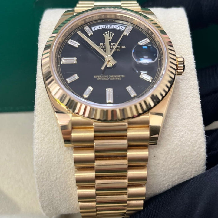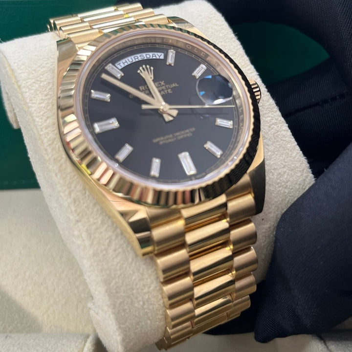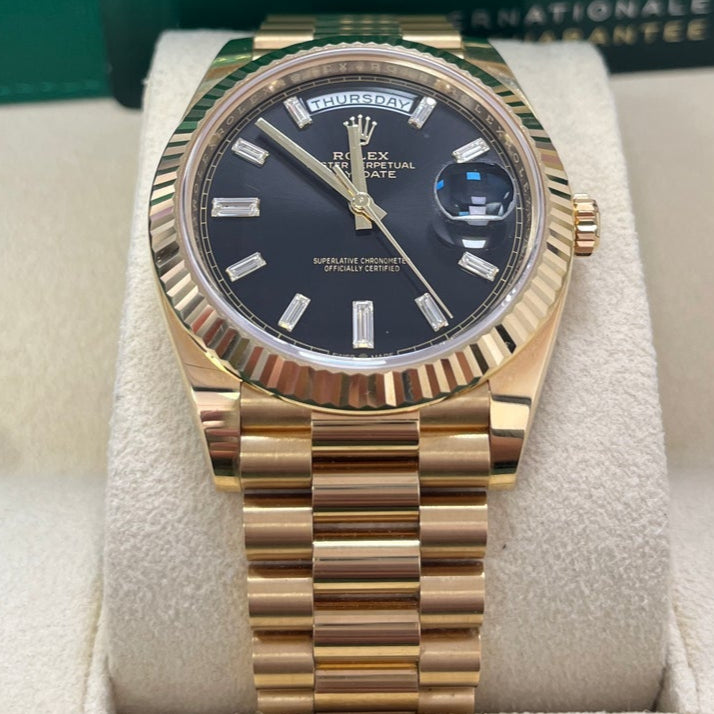 40mm 18K yellow gold case, screw-down back with Rolex fluting, screw-down crown with twinlock double waterproofness system, fluted bezel, scratch-resistant double anti-reflective sapphire crystal with cyclops lens over the date, black dial, 10 baguette diamond hour markers, Rolex calibre 3255 automatic movement with centre hour, minute and seconds hands, instantaneous day and date in apertures, unrestricted rapid-setting, and stop-seconds for precise time setting, approximately 70 hours of power reserve, President bracelet with three-piece solid links comprised of a polished center link, satin-finished outer links, and ceramic inserts, concealed folding Crownclasp buckle. Waterproof to 100 meters