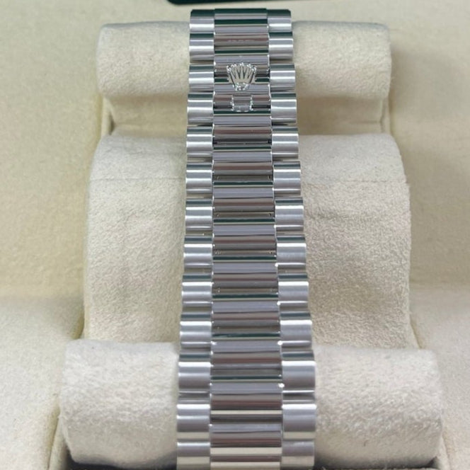 40mm platinum case, screw-down back, screw-down crown with twinlock double waterproofness system, fluted bezel, scratch-resistant sapphire crystal with cyclops lens over the date, ice blue dial, 10 baguette-cut hour markers, Rolex calibre 3255 perpetual self-winding movement with centre hour, minute and seconds hands, instantaneous day and date in apertures, unrestricted rapid-setting, and stop-seconds for precise time setting, approximately 70 hours of power reserve, President bracelet with semi-circular three-piece links, concealed folding Crownclasp buckle. Waterproof to 100 metres / 330 feet.