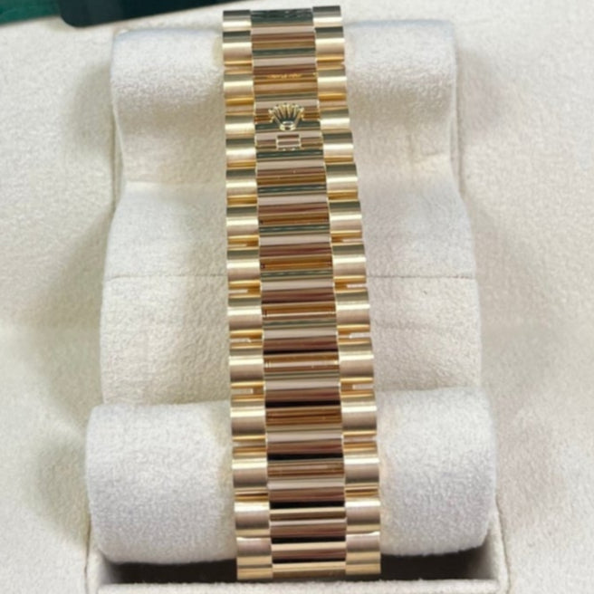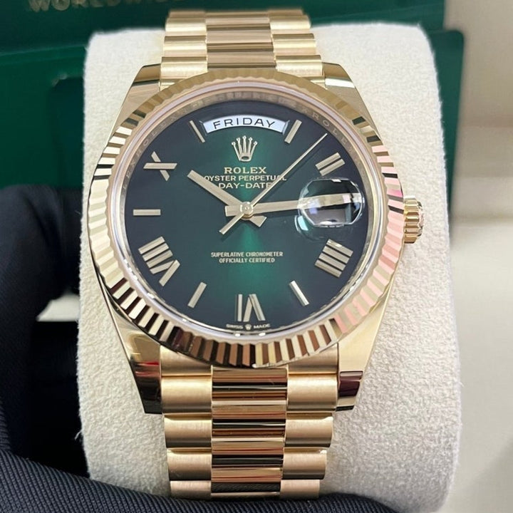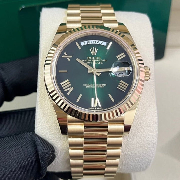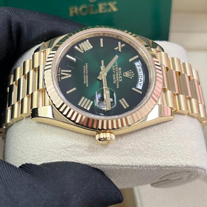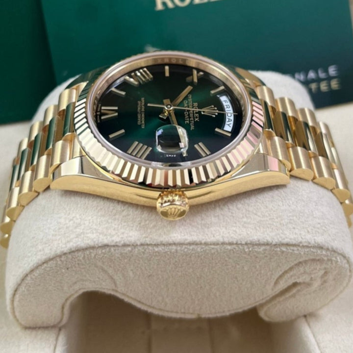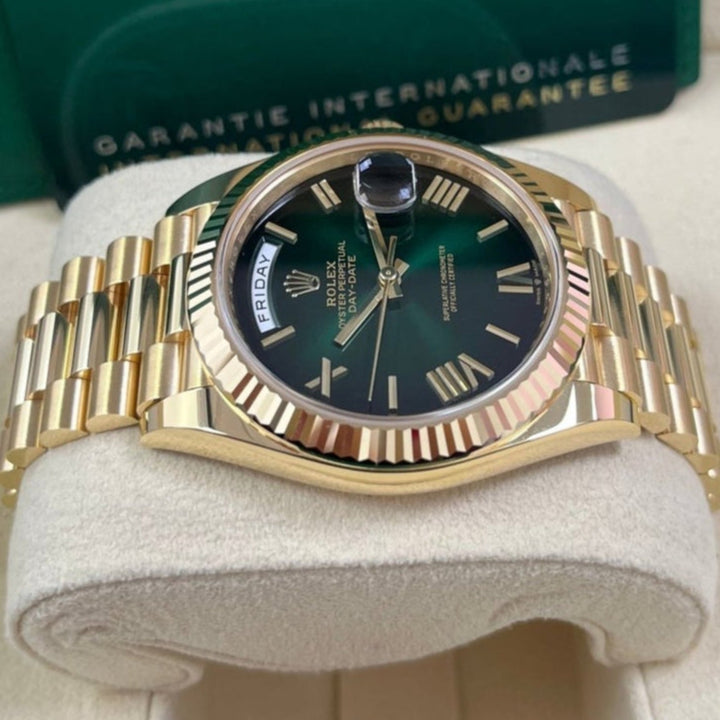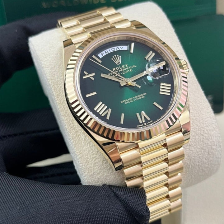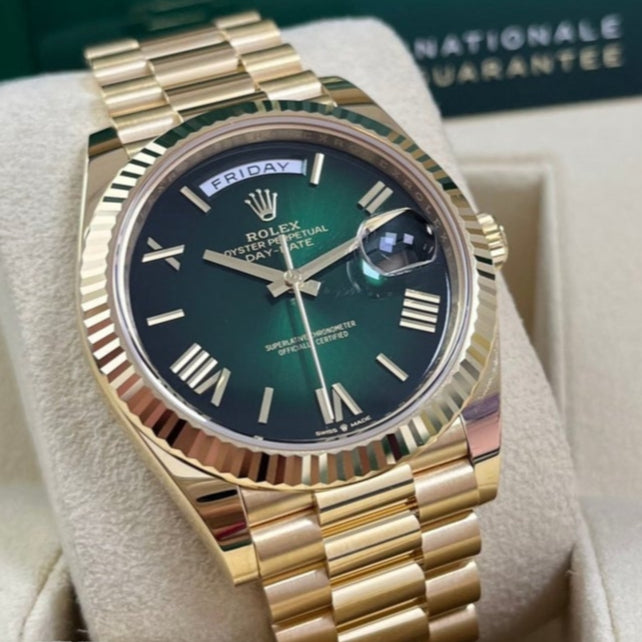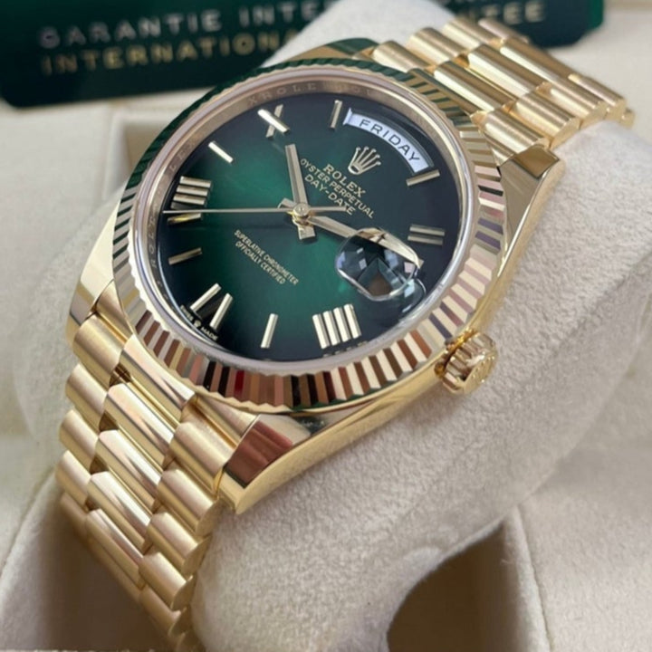 40mm 18K yellow gold case, screw-down back, screw-down crown with twinlock double waterproofness system, fluted bezel, scratch-resistant sapphire crystal with cyclops lens over the date, green ombré dial, bevelled deconstructed Roman numerals, Rolex calibre 3255 perpetual self-winding movement with centre hour, minute and seconds hands, instantaneous day and date in apertures, secure rapid-setting, and stop-seconds for exact time setting, approximately 70 hours of power reserve, President bracelet with semi-circular three-piece links, concealed folding Crownclasp buckle. Waterproof to 100 metres / 330 feet.