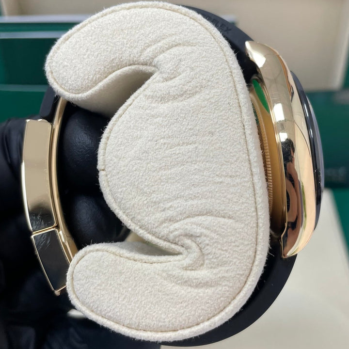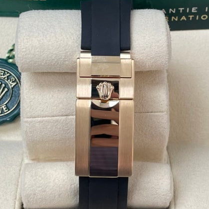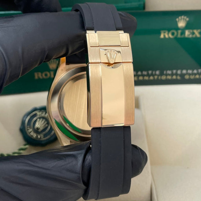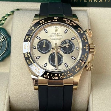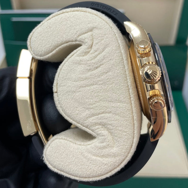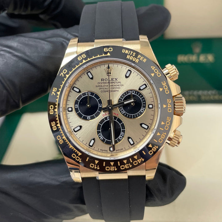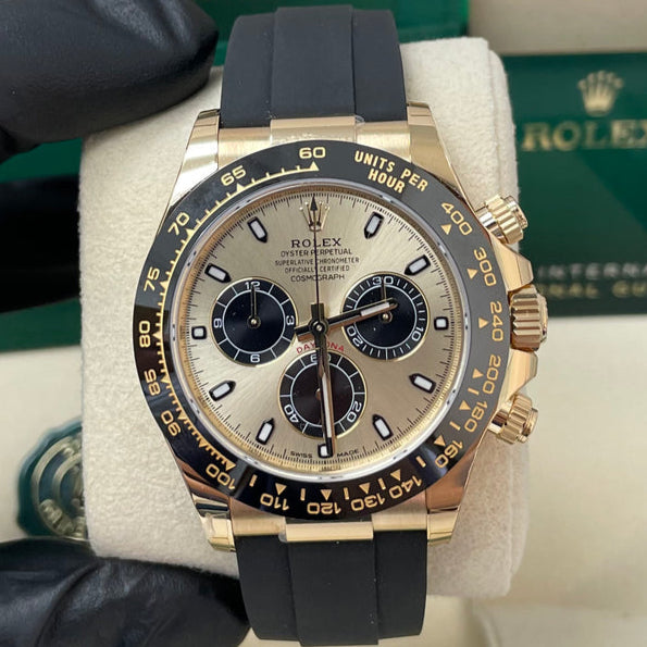 40mm 18K yellow gold case, screw-down yellow gold back, screw-down crown and push buttons with Triplock triple waterproofness, black monobloc Cerachrom bezel with engraved tachymetric scale, scratch-resistant double anti-reflective sapphire crystal, champagne dial with black subdials, index hour markers, Rolex calibre 4130 perpetual self-winding movement with chronograph central second hand, 30-minute counter at 3 o'clock, and 12-hour counter at 9 o'clock, approximately 72 hours of power reserve, black Oysterflex strap made from flexible metal blades overmoulded with high-performance elastomer, Oysterlock folding safety buckle with Easylink 5mm rapid extension system. Waterproof to 100 meters.