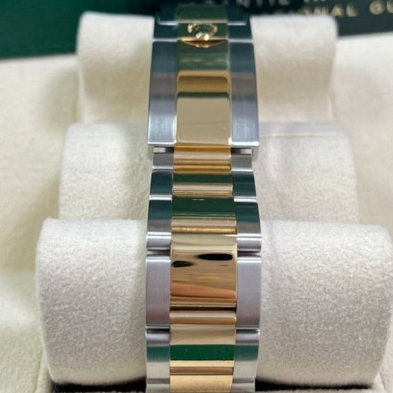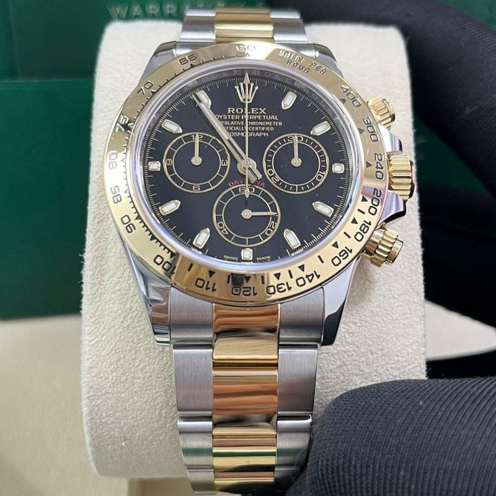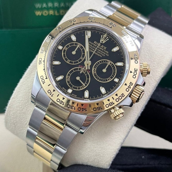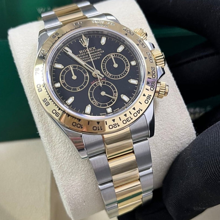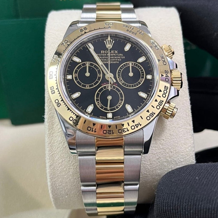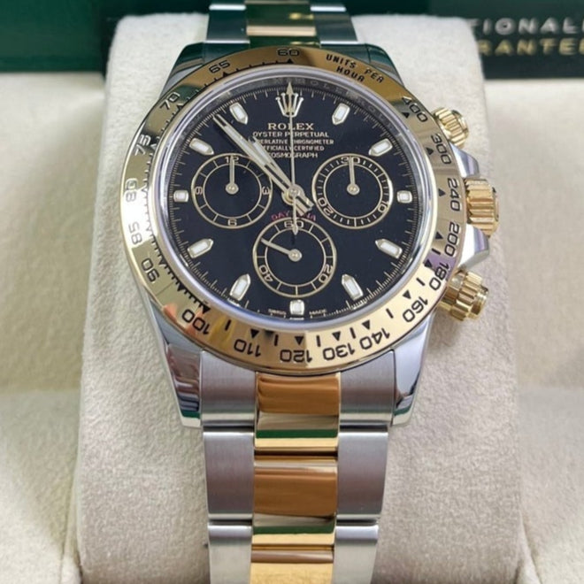 40mm Yellow Rolesor case with 904L steel monobloc middle case, screw-down steel back, screw-down crown and push buttons with Triplock triple waterproofness, fixed 18K yellow gold bezel with engraved tachymetric scale, scratch-resistant sapphire crystal, black dial, index hour markers, Rolex calibre 4130 self-winding movement with chronograph central second hand, 30-minute counter at 3 o'clock, and 12-hour counter at 9 o'clock, approximately 72 hours of power reserve, 18K yellow gold Oyster bracelet with flat three-piece links made from a combination of 904L steel and 18K yellow gold, folding Oysterlock buckle with Easylink 5mm comfort extension link. Waterproof to 100 meters. 2020.