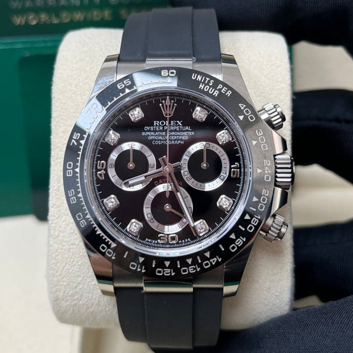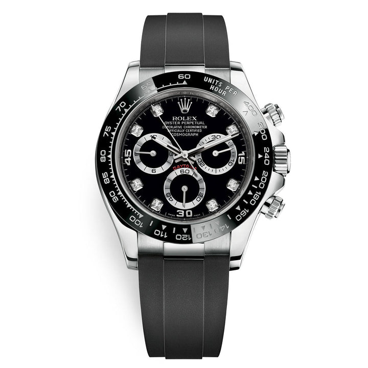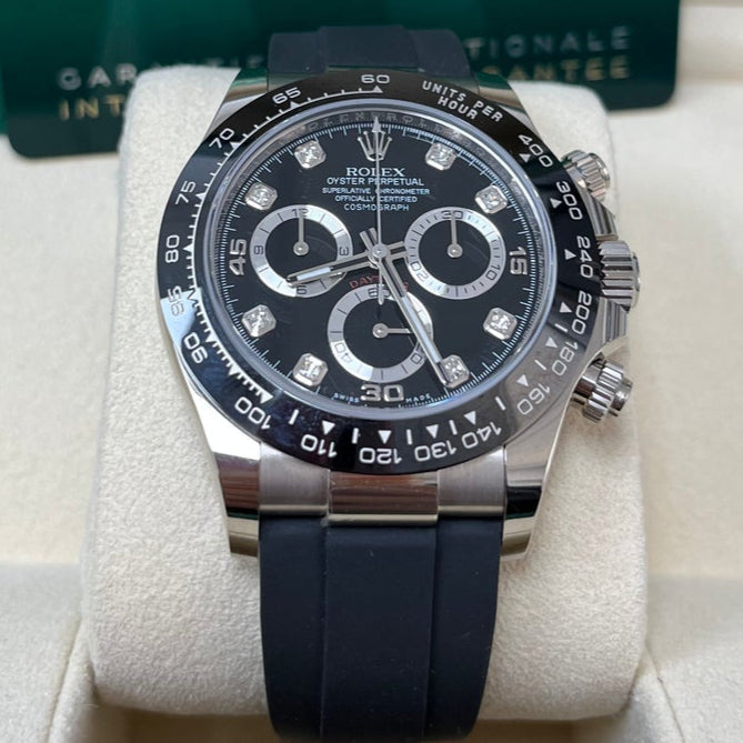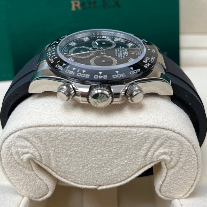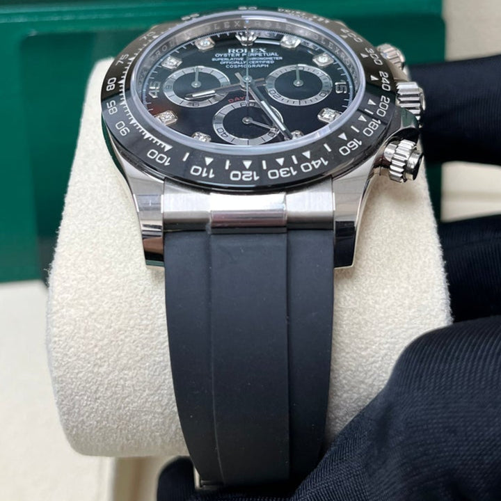 40mm 18K white gold case, screw-down white gold back, screw-down crown and push buttons with Triplock triple waterproofness, black monobloc Cerachrom bezel with engraved tachymetric scale, scratch-resistant double anti-reflective sapphire crystal, black dial, diamond hour markers, Rolex calibre 4130 perpetual self-winding movement with chronograph central second hand, 30-minute counter at 3 o'clock, and 12-hour counter at 9 o'clock, approximately 72 hours of power reserve, black Oysterflex strap made from flexible metal blades overmoulded with high-performance elastomer, Oysterlock folding safety buckle with Easylink 5mm rapid extension system. Waterproof to 100 meters.