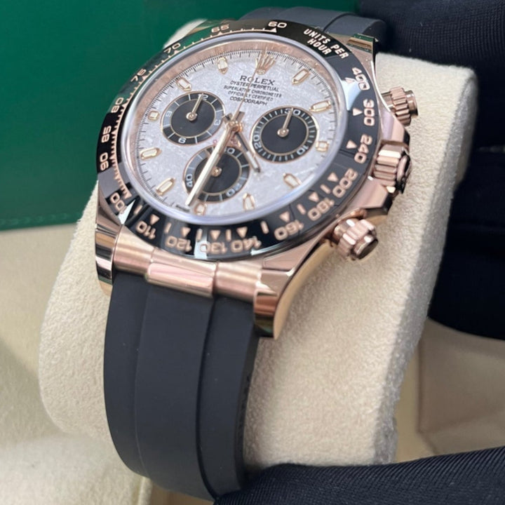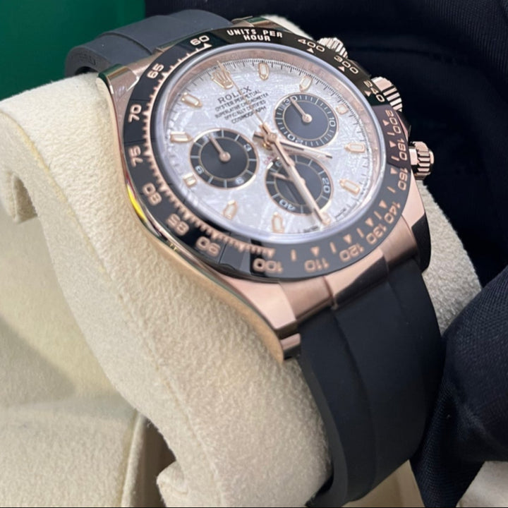 40mm 18K Everose gold case, screw-down Everose back, screw-down crown and push buttons with Triplock triple waterproofness, black monobloc Cerachrom bezel with engraved tachymetric scale, scratch-resistant double anti-reflective sapphire crystal, meteorite dial, black subdials, index hour markers, Rolex calibre 4130 perpetual self-winding movement with chronograph central second hand, 30-minute counter at 3 o'clock, and 12-hour counter at 9 o'clock, approximately 72 hours of power reserve, black Oysterflex strap made from flexible metal blades overmoulded with high-performance elastomer, Oysterlock folding safety buckle with Easylink 5mm rapid extension system. Waterproof to 100 meters.