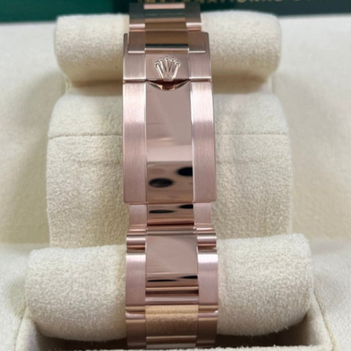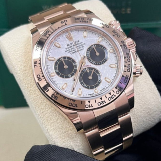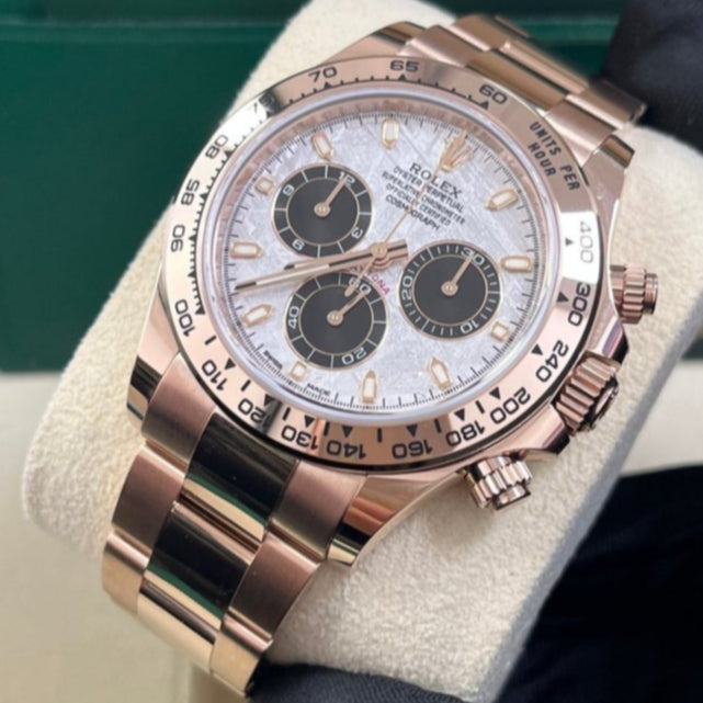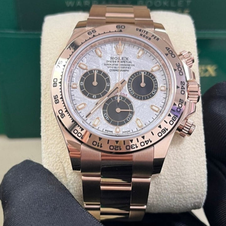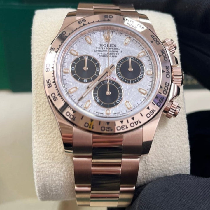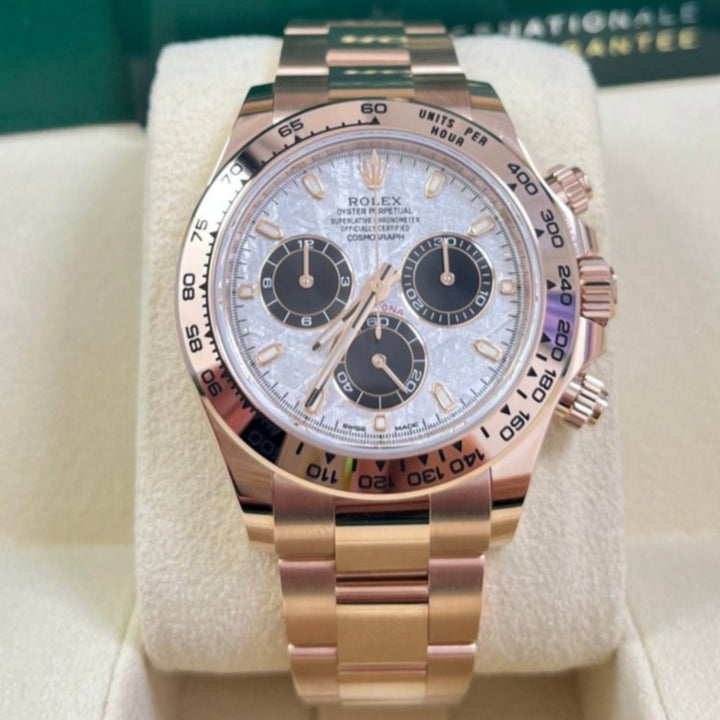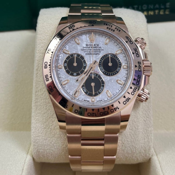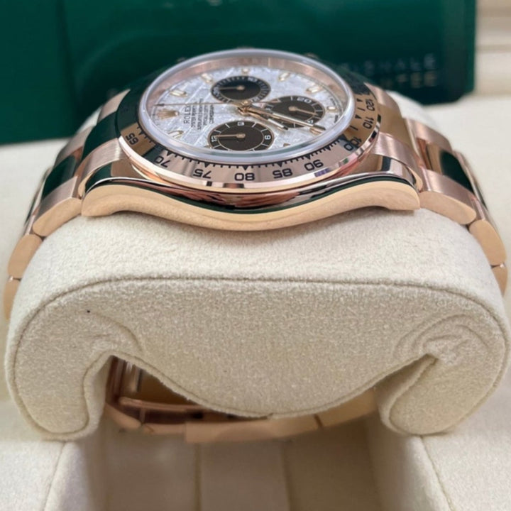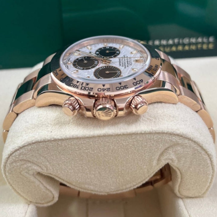 40mm 18K Everose gold case, screw-down back, screw-down crown and push buttons with Triplock triple waterproofness, fixed 18K yellow gold bezel with engraved tachymetric scale, scratch-resistant sapphire crystal, meteorite dial, black subdials, index hour markers, Rolex calibre 4130 self-winding movement with chronograph central second hand, 30-minute counter at 3 o'clock, and 12-hour counter at 9 o'clock, approximately 72 hours of power reserve, 18K Everose gold Oyster bracelet with flat three-piece links, folding Oysterlock buckle with Easylink 5mm comfort extension link. Waterproof to 100 meters.