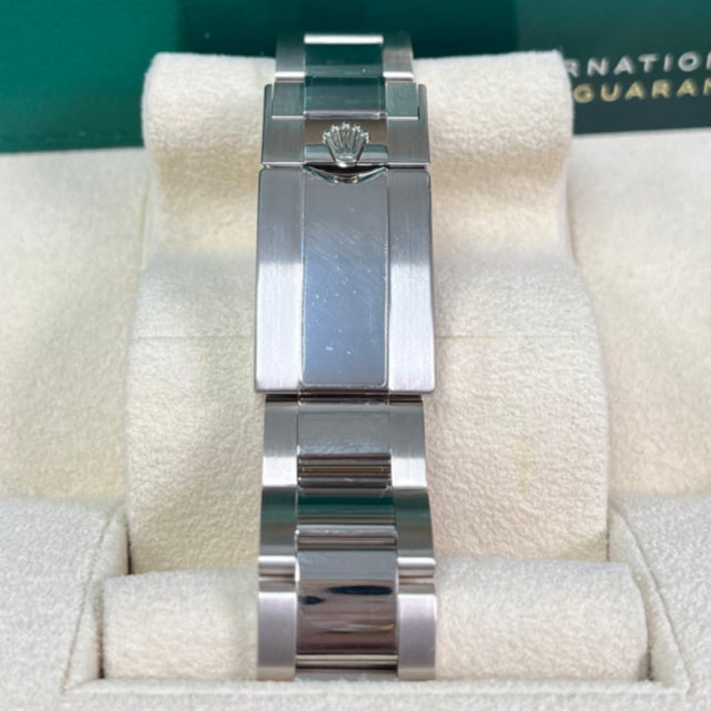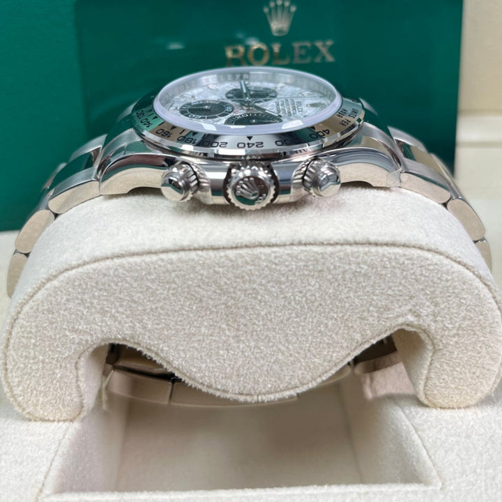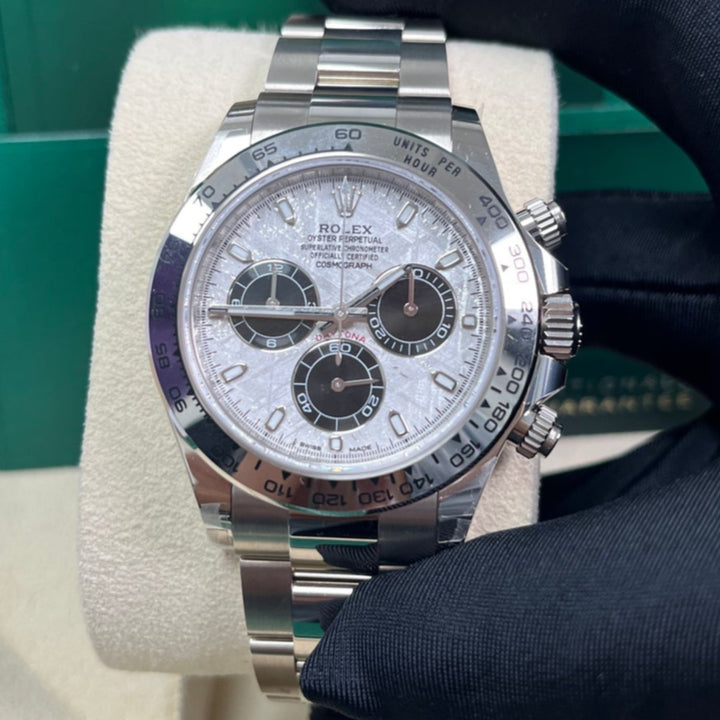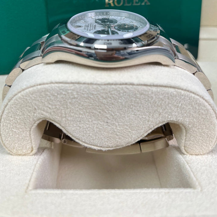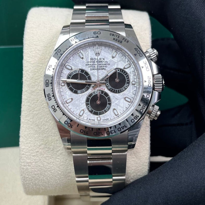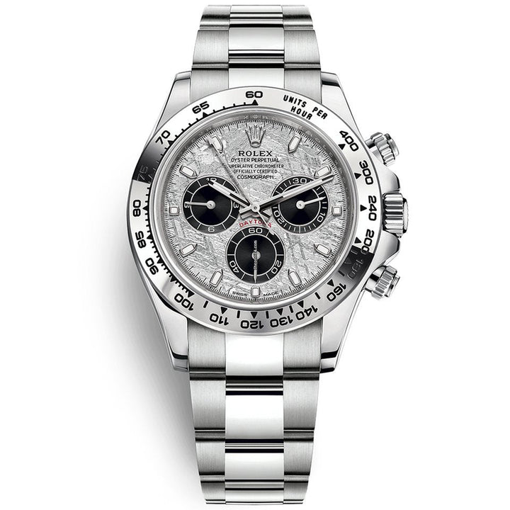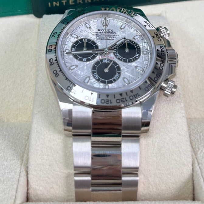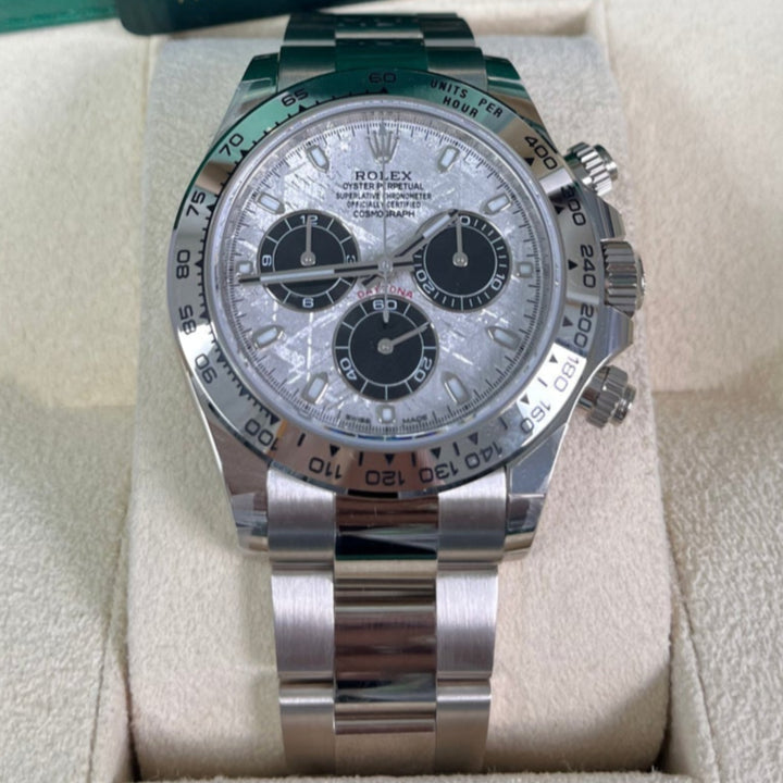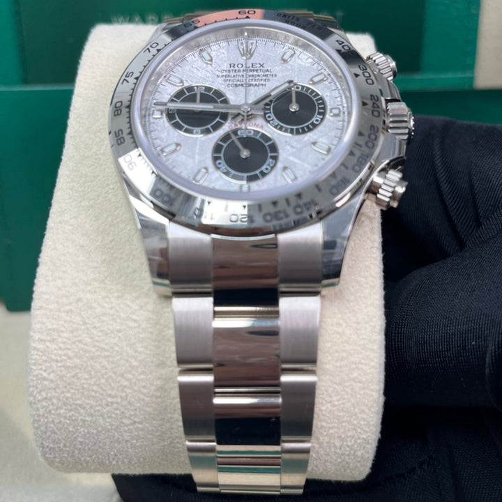 40mm 18K white gold case, screw-down back, screw-down crown and push buttons with Triplock triple waterproofness, fixed 18K yellow gold bezel with engraved tachymetric scale, scratch-resistant sapphire crystal, meteorite dial, black subdials, index hour markers, Rolex calibre 4130 self-winding movement with chronograph central second hand, 30-minute counter at 3 o'clock, and 12-hour counter at 9 o'clock, approximately 72 hours of power reserve, 18K white gold Oyster bracelet with flat three-piece links, folding Oysterlock buckle with Easylink 5mm comfort extension link. Waterproof to 100 meters.