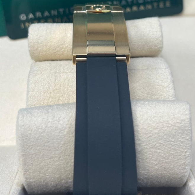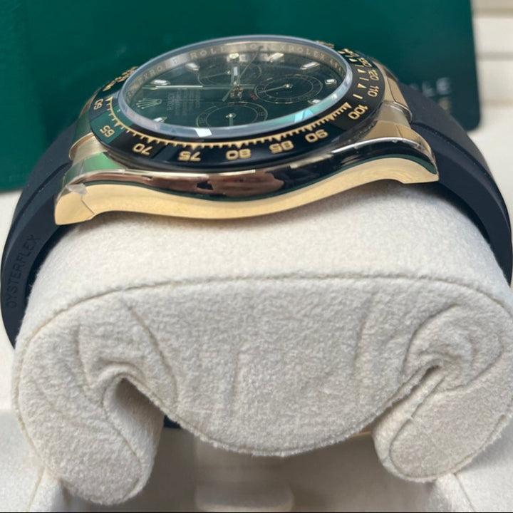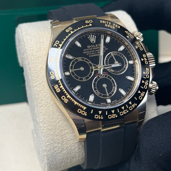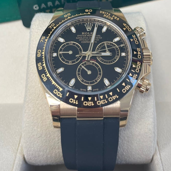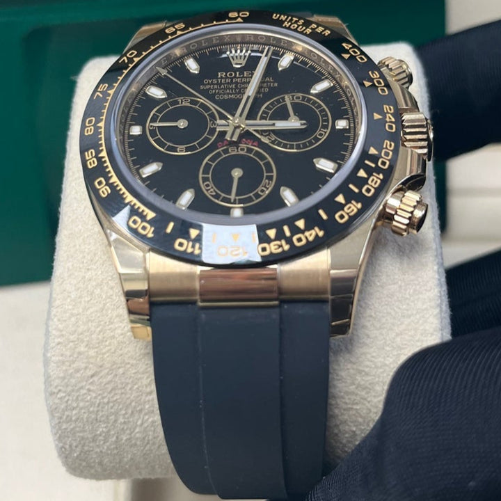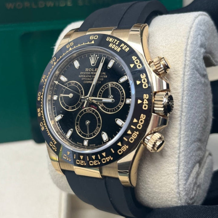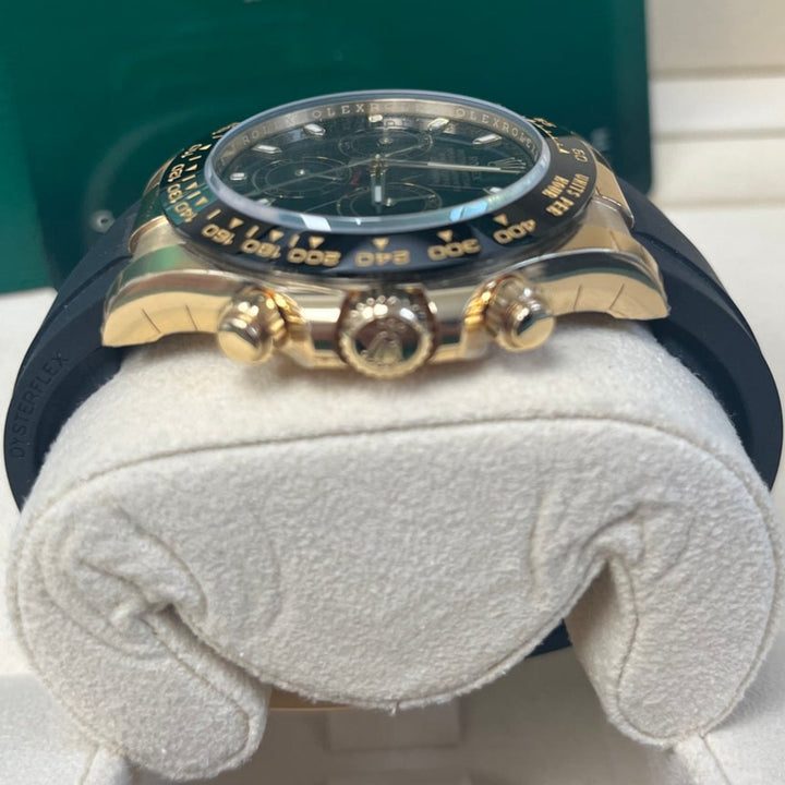 40mm 18K yellow gold case, screw-down yellow gold back, screw-down crown and push buttons with Triplock triple waterproofness, black monobloc Cerachrom bezel with engraved tachymetric scale, scratch-resistant double anti-reflective sapphire crystal, black dial, index hour markers, Rolex calibre 4130 perpetual self-winding movement with chronograph central second hand, 30-minute counter at 3 o'clock, and 12-hour counter at 9 o'clock, approximately 72 hours of power reserve, black Oysterflex strap made from flexible metal blades overmoulded with high-performance elastomer, Oysterlock folding safety buckle with Easylink 5mm rapid extension system. Waterproof to 100 meters.