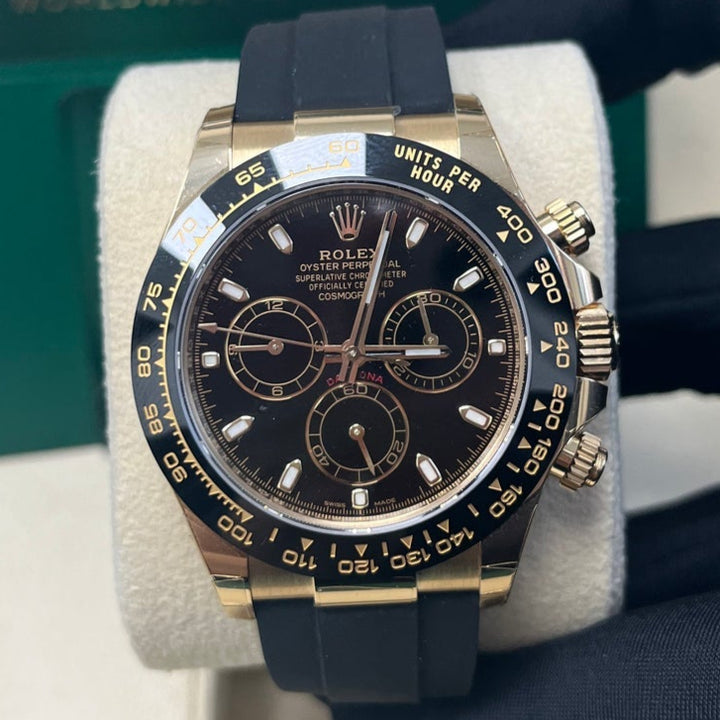 Rolex Daytona Yellow Gold Daytona 40 Watch - Black Index Dial - Black Oysterflex Strap 116518LN
